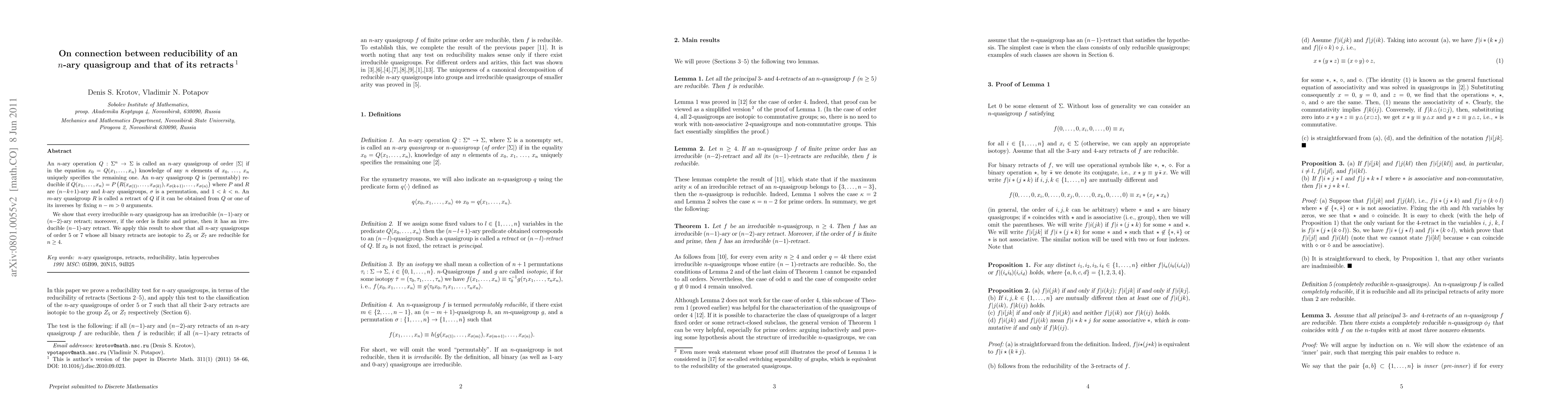 This research investigates the relationship between the reducibility of $n$-ary quasigroups and their retracts, proving that irreducible $n$-ary quasigroups possess irreducible $(n-1)$-ary or $(n-2)$-ary retracts. It also demonstrates the reducibility of $n$-ary quasigroups of orders 5 or 7 when all binary retracts are isotopic to $Z_5$ or $Z_7$ for $n>3$.