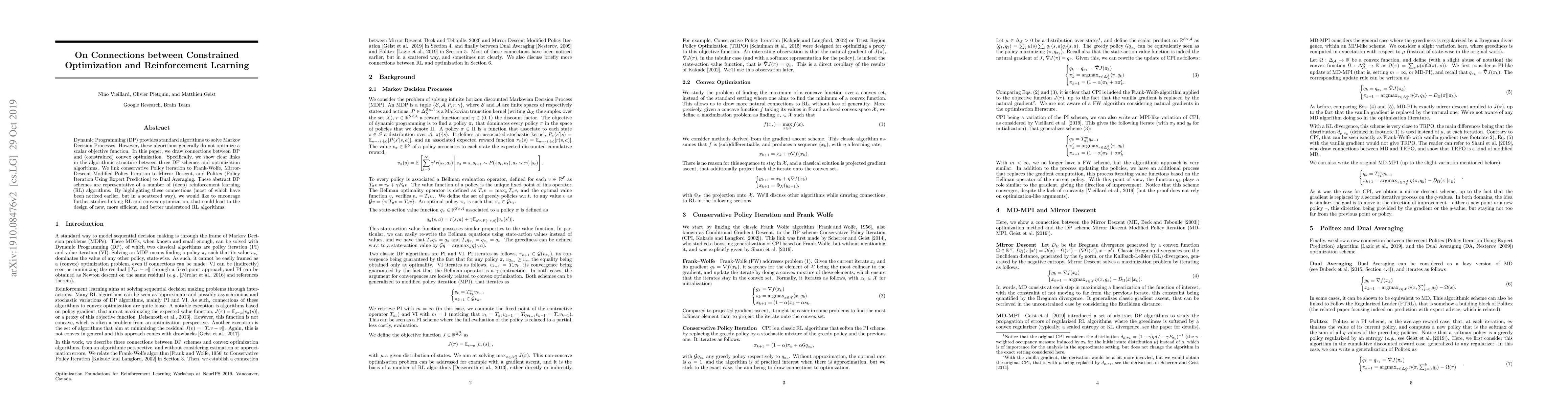 This paper establishes connections between Dynamic Programming (DP) algorithms for Markov Decision Processes and constrained convex optimization techniques. It links three DP schemes to specific optimization algorithms, aiming to foster further research that could lead to more efficient Reinforcement Learning algorithms.