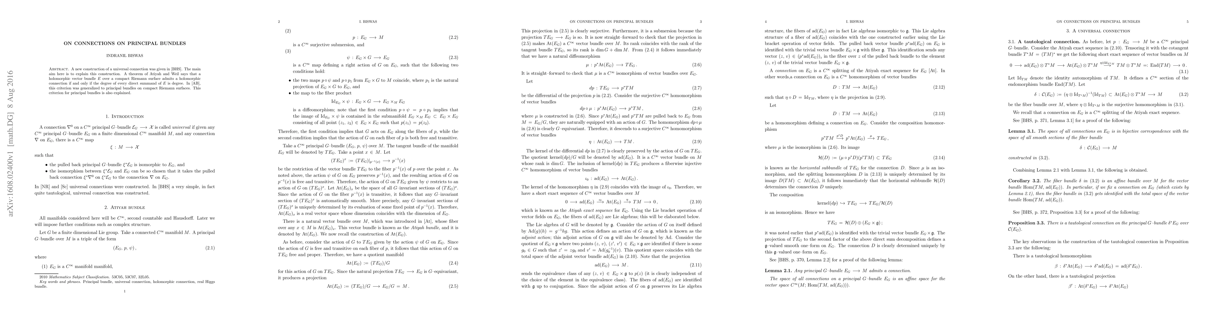 A new construction of a universal connection was given in \cite{BHS}. The main aim here is to explain this construction. A theorem of Atiyah and Weil says that a holomorphic vector bundle $E$ over a compact Riemann surface admits a holomorphic connection if and only if the degree of every direct summand of $E$ is degree. In \cite{AB}, this criterion was generalized to principal bundles on compact Riemann surfaces. This criterion for principal bundles is also explained.