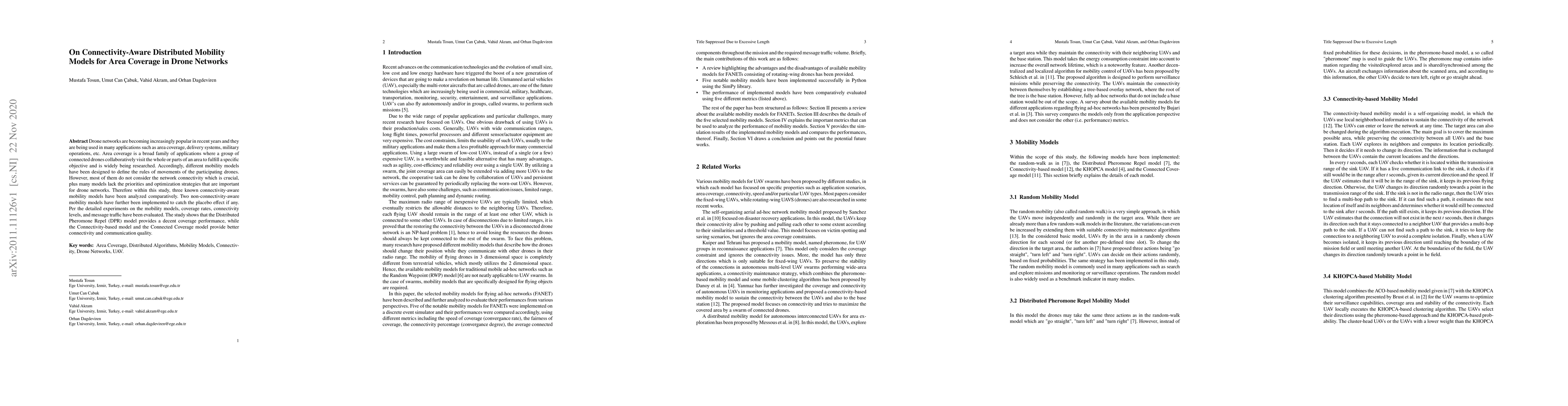 This study compares three connectivity-aware mobility models for drone networks focusing on area coverage, finding that the Distributed Pheromone Repel (DPR) model offers good coverage performance, while the Connectivity-based and Connected Coverage models enhance connectivity and communication quality.