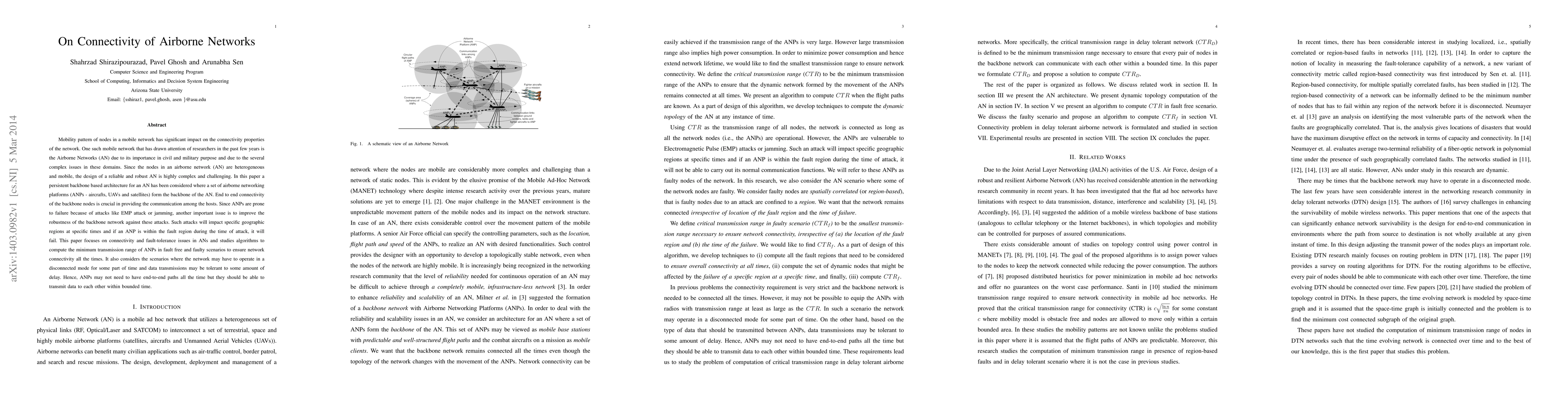 This paper explores connectivity and fault-tolerance in Airborne Networks (AN) using a persistent backbone architecture formed by airborne networking platforms (ANPs). It proposes algorithms to determine the minimum transmission range of ANPs to maintain network connectivity under both fault-free and faulty conditions, including scenarios where the network operates in a disconnected mode with tolerable delays.