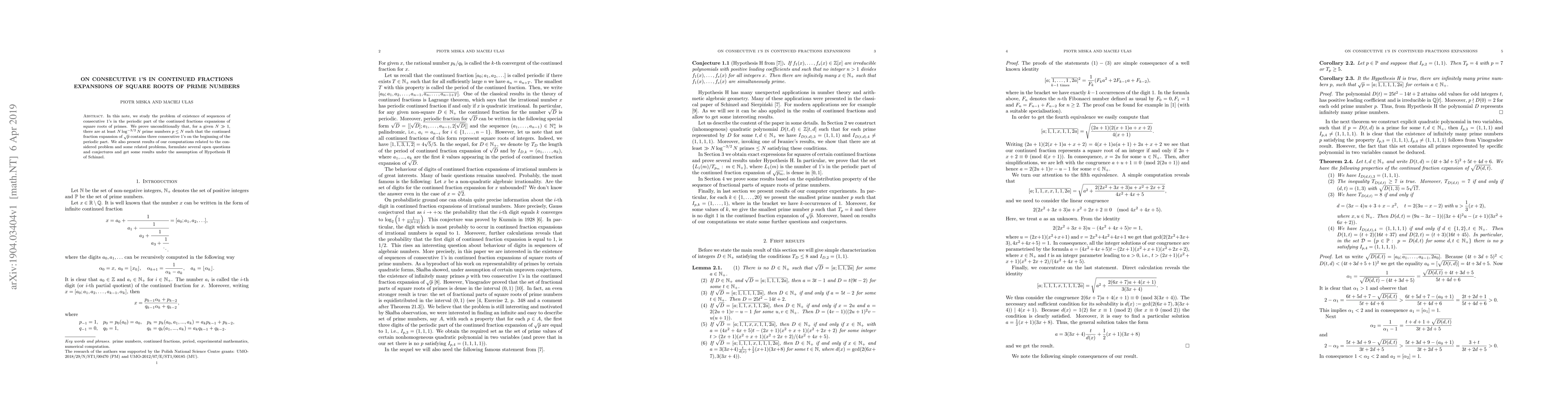 In this note, we study the problem of existence of sequences of consecutive 1's in the periodic part of the continued fractions expansions of square roots of primes. We prove unconditionally that, for a given $N\gg 1$, there are at least $N\log^{-3/2}N$ prime numbers $p\leq N$ such that the continued fraction expansion of $\sqrt{p}$ contains three consecutive 1's on the beginning of the periodic part. We also present results of our computations related to the considered problem and some related problems, formulate several open questions and conjectures and get some results under the assumption of Hypothesis H of Schinzel.