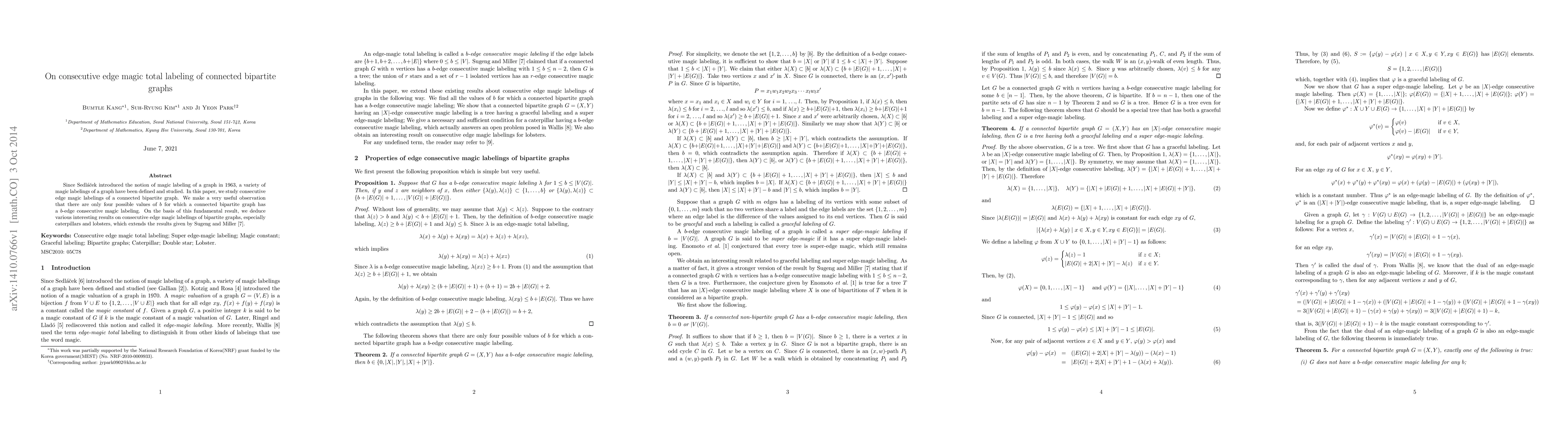 The paper studies consecutive edge magic total labelings of connected bipartite graphs, identifying that there are only four possible values of $b$ for which such labelings exist.