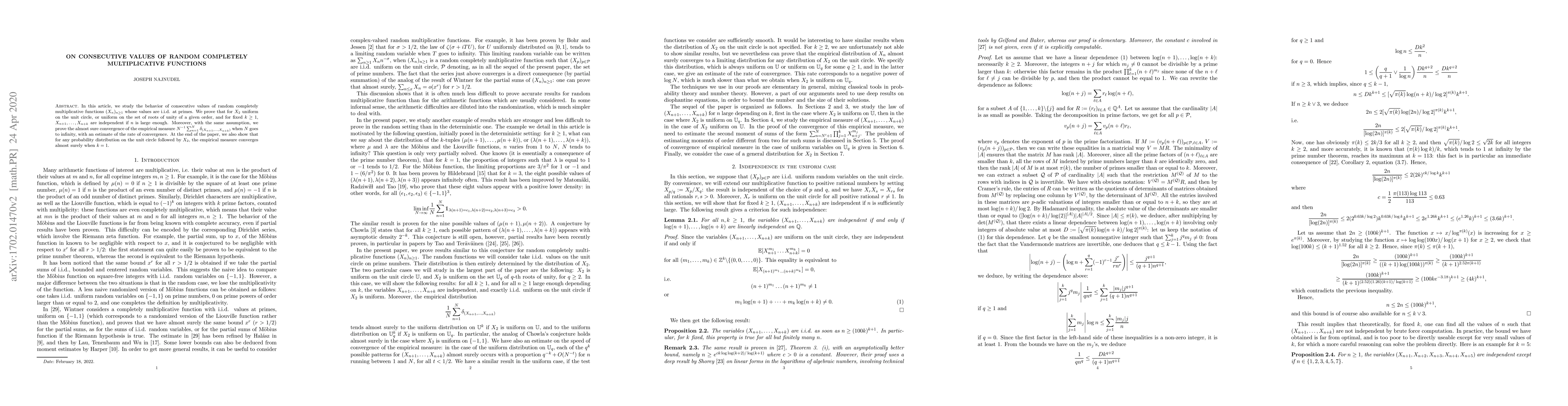 In this article, we study the behavior of consecutive values of random completely multiplicative functions $(X_n)_{n \geq 1}$ whose values are i.i.d. at primes. We prove that for $X_2$ uniform on the unit circle, or uniform on the set of roots of unity of a given order, and for fixed $k \geq 1$, $X_{n+1}, \dots, X_{n+k}$ are independent if $n$ is large enough. Moreover, with the same assumption, we prove the almost sure convergence of the empirical measure $N^{-1} \sum_{n=1}^N \delta_{(X_{n+1}, \dots, X_{n+k})}$ when $N$ goes to infinity, with an estimate of the rate of convergence. At the end of the paper, we also show that for any probability distribution on the unit circle followed by $X_2$, the empirical measure converges almost surely when $k=1$.