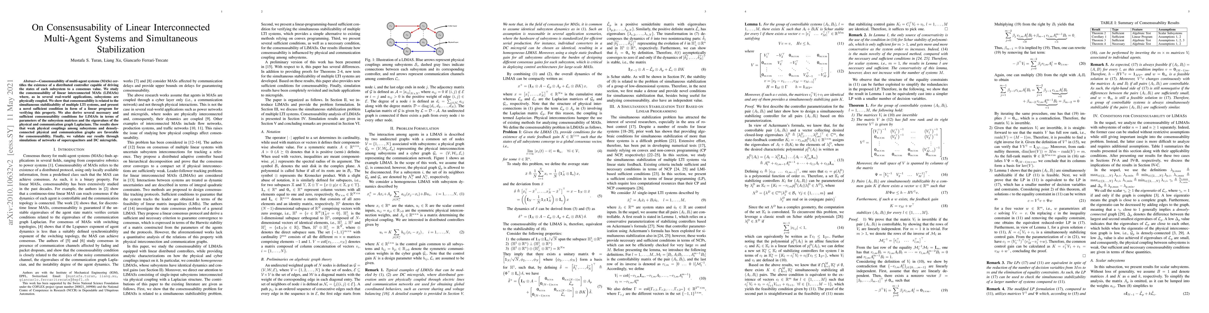 Consensusability of multi-agent systems (MASs) certifies the existence of a distributed controller capable of driving the states of each subsystem to a consensus value. We study the consensusability of linear interconnected MASs (LIMASs) where, as in several real-world applications, subsystems are physically coupled. We show that consensusability is related to the simultaneous stabilizability of multiple LTI systems, and present a novel sufficient condition in form of a linear program for verifying this property. We also derive several necessary and sufficient consensusability conditions for LIMASs in terms of parameters of the subsystem matrices and the eigenvalues of the physical and communication graph Laplacians. The results show that weak physical couplings among subsystems and densely-connected physical and communication graphs are favorable for consensusability. Finally, we validate our results through simulations of networks of supercapacitors and DC microgrids.