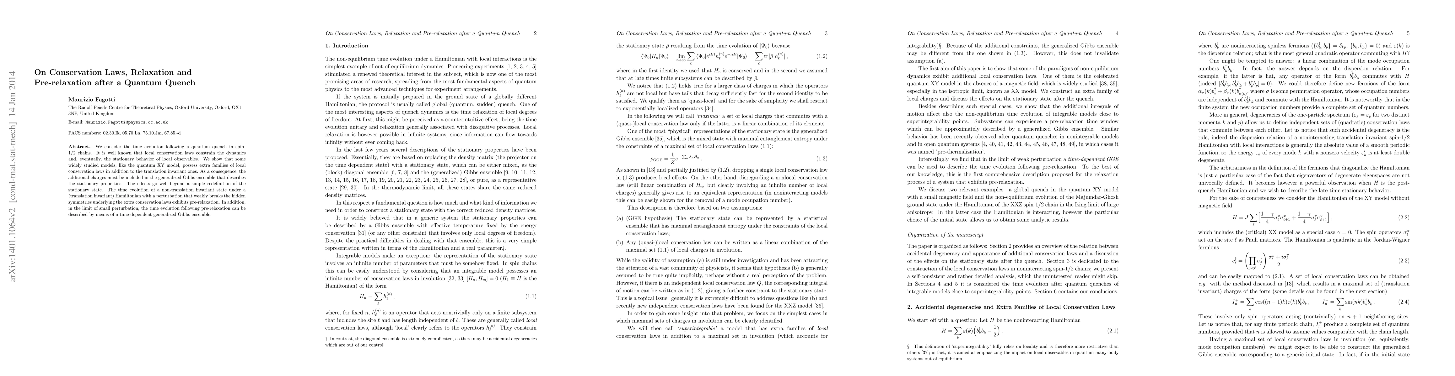 This paper investigates the dynamics following a quantum quench in spin-1/2 chains, revealing that additional local conservation laws beyond translation invariant ones exist in models like the quantum XY model. These extra charges necessitate inclusion in the generalized Gibbs ensemble, leading to pre-relaxation phenomena before reaching the final stationary state.