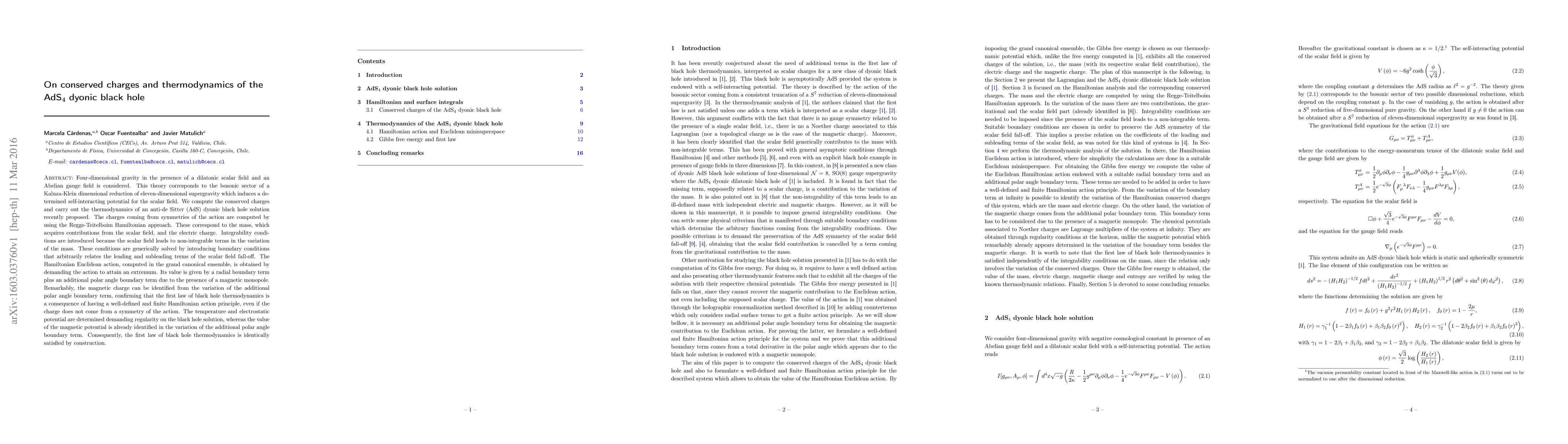 Four-dimensional gravity in the presence of a dilatonic scalar field and an Abelian gauge field is considered. This theory corresponds to the bosonic sector of a Kaluza-Klein dimensional reduction of eleven-dimensional supergravity which induces a determined self-interacting potential for the scalar field. We compute the conserved charges and carry out the thermodynamics of an anti-de Sitter (AdS) dyonic black hole solution recently proposed. The charges coming from symmetries of the action are computed by using the Regge-Teitelboim Hamiltonian approach. These correspond to the mass, which acquires contributions from the scalar field, and the electric charge. Integrability conditions are introduced because the scalar field leads to non-integrable terms in the variation of the mass. These conditions are generically solved by introducing boundary conditions that arbitrarily relates the leading and subleading terms of the scalar field fall-off. The Hamiltonian Euclidean action, computed in the grand canonical ensemble, is obtained by demanding the action to attain an extremum. Its value is given by a radial boundary term plus an additional polar angle boundary term due to the presence of a magnetic monopole. Remarkably, the magnetic charge can be identified from the variation of the additional polar angle boundary term, confirming that the first law of black hole thermodynamics is a consequence of having a well-defined and finite Hamiltonian action principle, even if the charge does not come from a symmetry of the action. The temperature and electrostatic potential are determined demanding regularity on the black hole solution, whereas the value of the magnetic potential is already identified in the variation of the additional polar angle boundary term. Consequently, the first law of black hole thermodynamics is identically satisfied by construction.