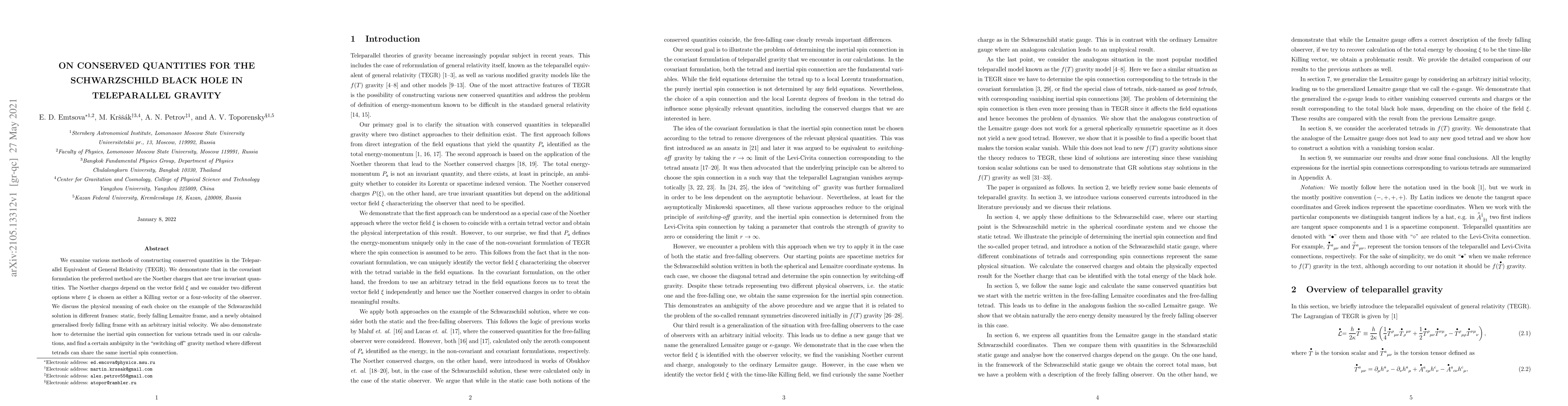 We examine various methods of constructing conserved quantities in the Teleparallel Equivalent of General Relativity (TEGR). We demonstrate that in the covariant formulation the preferred method are the Noether charges that are true invariant quantities. The Noether charges depend on the vector field $\xi$ and we consider two different options where $\xi$ is chosen as either a Killing vector or a four-velocity of the observer. We discuss the physical meaning of each choice on the example of the Schwarzschild solution in different frames: static, freely falling Lemaitre frame, and a newly obtained generalised freely falling frame with an arbitrary initial velocity. We also demonstrate how to determine the inertial spin connection for various tetrads used in our calculations, and find a certain ambiguity in the "switching off" gravity method where different tetrads can share the same inertial spin connection.