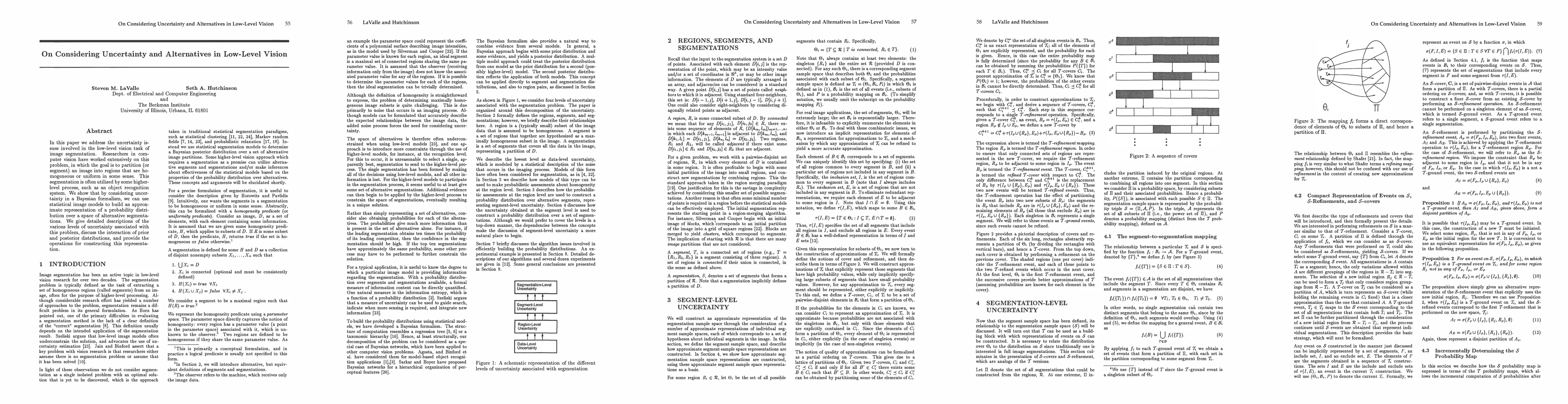 In this paper we address the uncertainty issues involved in the low-level vision task of image segmentation. Researchers in computer vision have worked extensively on this problem, in which the goal is to partition (or segment) an image into regions that are homogeneous or uniform in some sense. This segmentation is often utilized by some higher level process, such as an object recognition system. We show that by considering uncertainty in a Bayesian formalism, we can use statistical image models to build an approximate representation of a probability distribution over a space of alternative segmentations. We give detailed descriptions of the various levels of uncertainty associated with this problem, discuss the interaction of prior and posterior distributions, and provide the operations for constructing this representation.