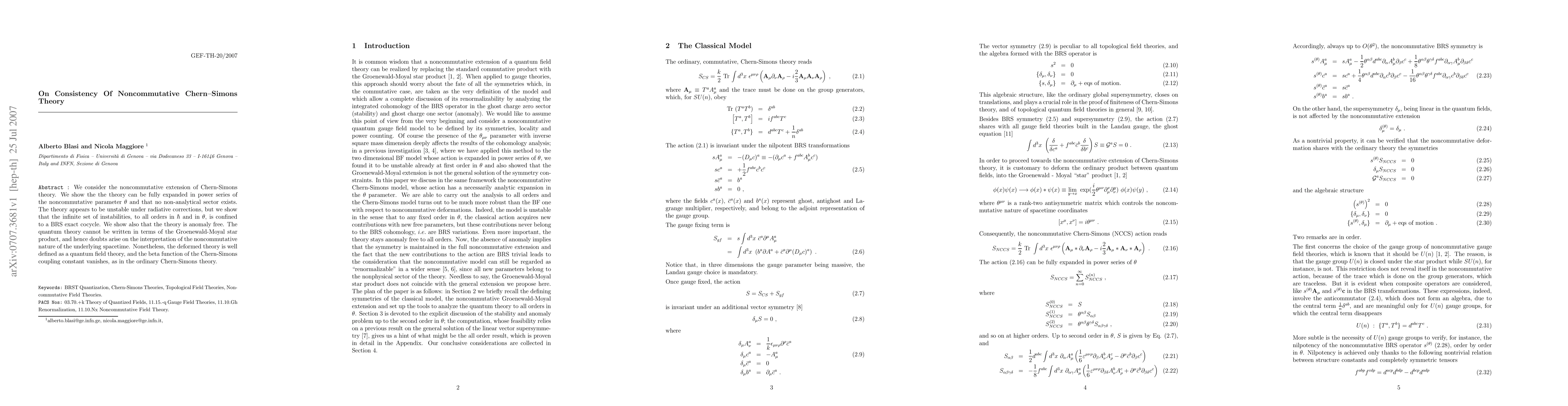 The paper investigates the consistency of the noncommutative extension of Chern-Simons theory, demonstrating it can be expanded in a power series without non-analytical sectors. Despite apparent instability under radiative corrections, these are confined to a BRS exact cocycle and the theory is shown to be anomaly free.