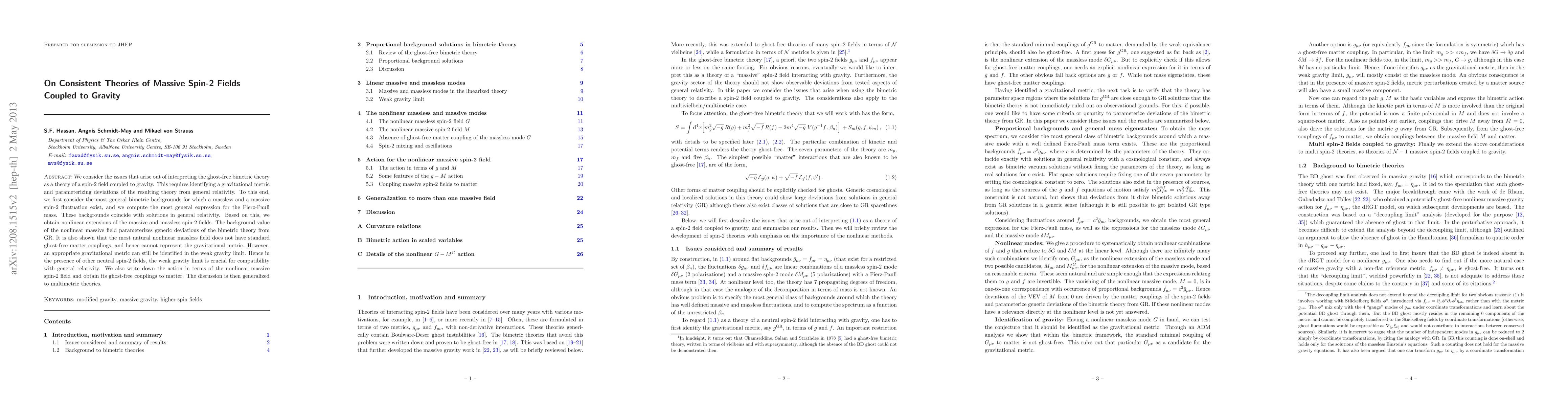 We consider the issues that arise out of interpreting the ghost-free bimetric theory as a theory of a spin-2 field coupled to gravity. This requires identifying a gravitational metric and parameterizing deviations of the resulting theory from general relativity. To this end, we first consider the most general bimetric backgrounds for which a massless and a massive spin-2 fluctuation with Fierz-Pauli mass exist. These backgrounds coincide with solutions in general relativity. Based on this, we obtain nonlinear extensions of the massive and massless spin-2 fields. The background value of the nonlinear massive field parameterizes generic deviations of the bimetric theory from GR. It is also shown that the nonlinear massless field does not have standard ghost-free matter couplings, and hence cannot represent the gravitational metric. However, an appropriate gravitational metric can still be identified in the weak gravity limit. Hence in the presence of other neutral spin-2 fields, the weak gravity limit is crucial for compatibility with general relativity. We also write down the action in terms of the nonlinear massive spin-2 field and obtain its ghost-free couplings to matter. The discussion is then generalized to multimetric theories.
