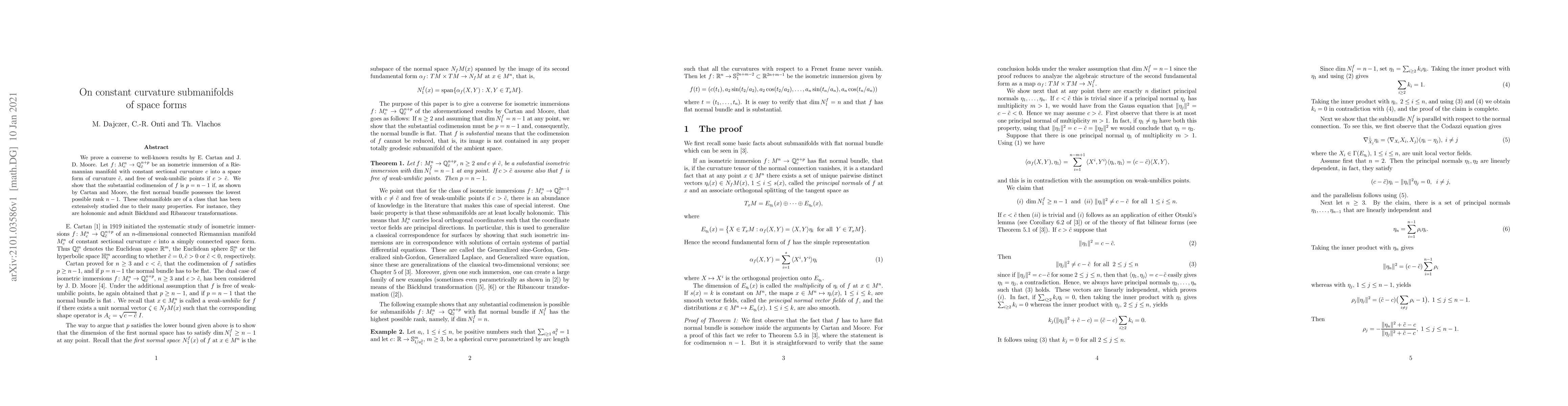 This paper proves a converse to results by Cartan and Moore, showing that an isometric immersion of a Riemannian manifold with constant curvature into a space form, free of weak-umbilic points, has substantial codimension $n-1$ if the first normal bundle has the lowest possible rank $n-1$. These submanifolds are holonomic and support Bäcklund and Ribaucour transformations.