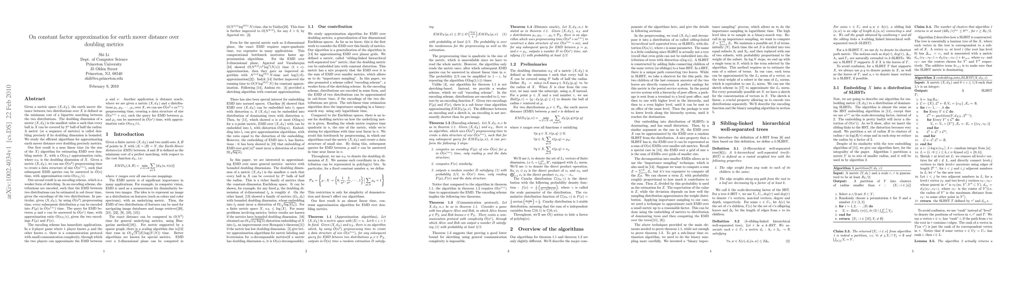 Given a metric space $(X,d_X)$, the earth mover distance between two distributions over $X$ is defined as the minimum cost of a bipartite matching between the two distributions. The doubling dimension of a metric $(X, d_X)$ is the smallest value $\alpha$ such that every ball in $X$ can be covered by $2^\alpha$ ball of half the radius. We study efficient algorithms for approximating earth mover distance over metrics with bounded doubling dimension. Given a metric $(X, d_X)$, with $|X| = n$, we can use $\tilde O(n^2)$ preprocessing time to create a data structure of size $\tilde O(n^{1 + \e})$, such that subsequently queried EMDs can be $O(\alpha_X/\e)$-approximated in $\tilde O(n)$ time. We also show a weaker form of sketching scheme, which we call "encoding scheme". Given $(X, d_X)$, by using $\tilde O(n^2)$ preprocessing time, every subsequent distribution $\mu$ over $X$ can be encoded into $F(\mu)$ in $\tilde O(n^{1 + \e})$ time. Given $F(\mu)$ and $F(\nu)$, the EMD between $\mu$ and $\nu$ can be $O(\alpha_X/\e)$-approximated in $\tilde O(n^\e)$ time.