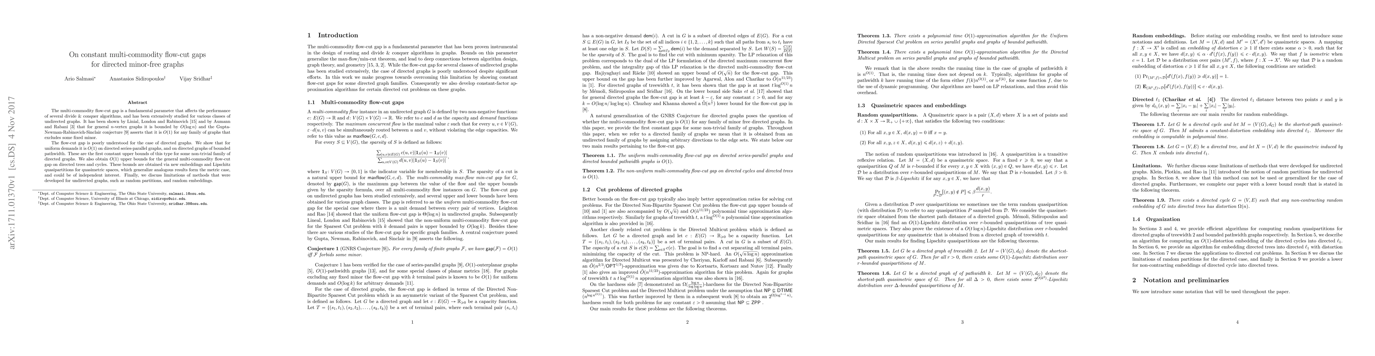 This paper explores the multi-commodity flow-cut gap for directed minor-free graphs, demonstrating that it is constant ($O(1)$) for uniform demands on directed series-parallel graphs, directed graphs of bounded pathwidth, directed trees, and cycles. The findings utilize new embeddings and Lipschitz quasipartitions for quasimetric spaces, extending metric-based results.