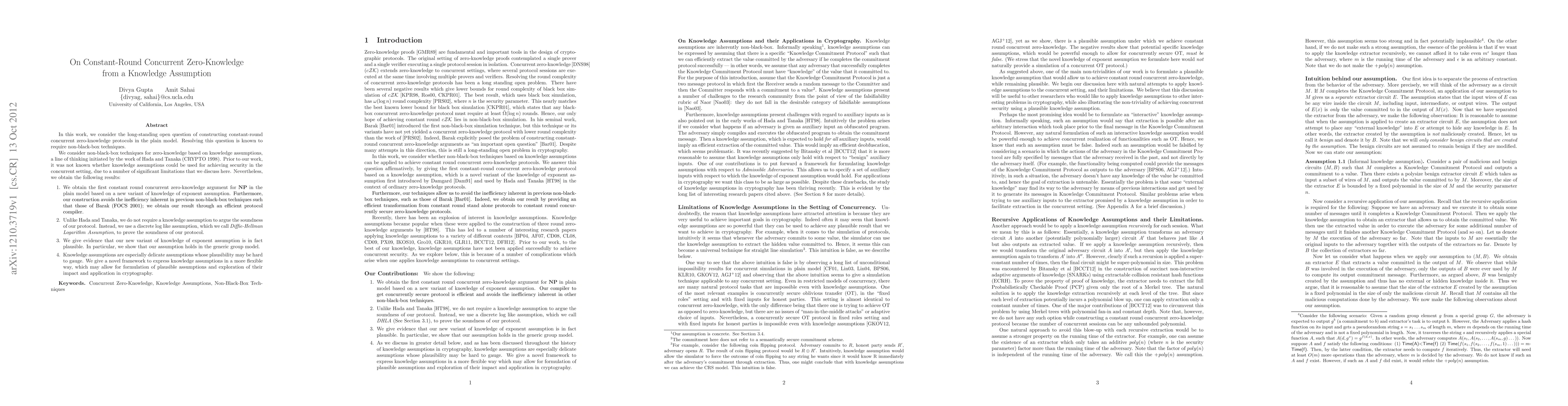 In this work, we consider the long-standing open question of constructing constant-round concurrent zero-knowledge protocols in the plain model. Resolving this question is known to require non-black-box techniques. We consider non-black-box techniques for zero-knowledge based on knowledge assumptions, a line of thinking initiated by the work of Hada and Tanaka (CRYPTO 1998). Prior to our work, it was not known whether knowledge assumptions could be used for achieving security in the concurrent setting, due to a number of significant limitations that we discuss here. Nevertheless, we obtain the following results: 1. We obtain the first constant round concurrent zero-knowledge argument for \textbf{NP} in the plain model based on a new variant of knowledge of exponent assumption. Furthermore, our construction avoids the inefficiency inherent in previous non-black-box techniques such that those of Barak (FOCS 2001); we obtain our result through an efficient protocol compiler. 2. Unlike Hada and Tanaka, we do not require a knowledge assumption to argue the soundness of our protocol. Instead, we use a discrete log like assumption, which we call Diffie-Hellman Logarithm Assumption, to prove the soundness of our protocol. 3. We give evidence that our new variant of knowledge of exponent assumption is in fact plausible. In particular, we show that our assumption holds in the generic group model. 4. Knowledge assumptions are especially delicate assumptions whose plausibility may be hard to gauge. We give a novel framework to express knowledge assumptions in a more flexible way, which may allow for formulation of plausible assumptions and exploration of their impact and application in cryptography.