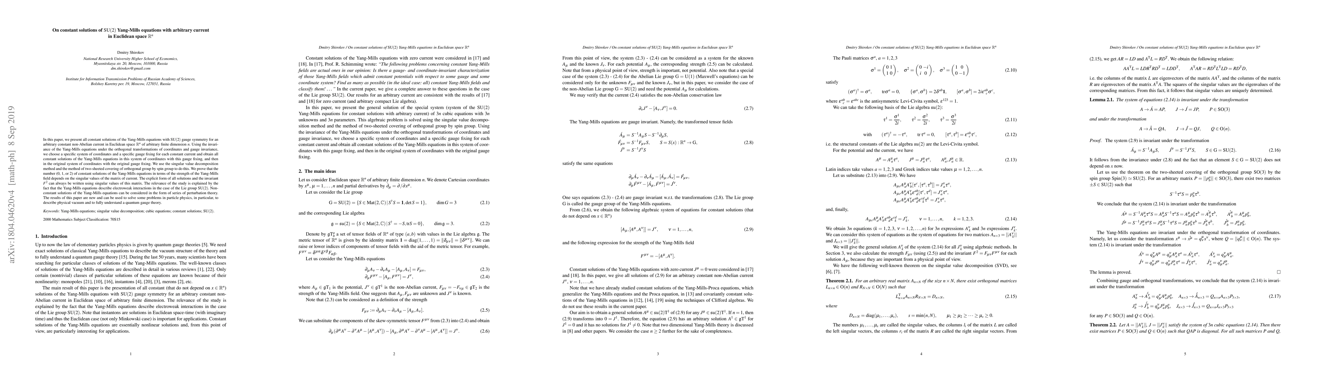 In this paper, we present all constant solutions of the Yang-Mills equations with ${\rm SU}(2)$ gauge symmetry for an arbitrary constant non-Abelian current in Euclidean space ${\mathbb R}^n$ of arbitrary finite dimension $n$. Using the invariance of the Yang-Mills equations under the orthogonal transformations of coordinates and gauge invariance, we choose a specific system of coordinates and a specific gauge fixing for each constant current and obtain all constant solutions of the Yang-Mills equations in this system of coordinates with this gauge fixing, and then in the original system of coordinates with the original gauge fixing. We use the singular value decomposition method and the method of two-sheeted covering of orthogonal group by spin group to do this. We prove that the number (0, 1, or 2) of constant solutions of the Yang-Mills equations in terms of the strength of the Yang-Mills field depends on the singular values of the matrix of current. The explicit form of all solutions and the invariant $F^2$ can always be written using singular values of this matrix. The relevance of the study is explained by the fact that the Yang-Mills equations describe electroweak interactions in the case of the Lie group ${\rm SU}(2)$. Nonconstant solutions of the Yang-Mills equations can be considered in the form of series of perturbation theory. The results of this paper are new and can be used to solve some problems in particle physics, in particular, to describe physical vacuum and to fully understand a quantum gauge theory.