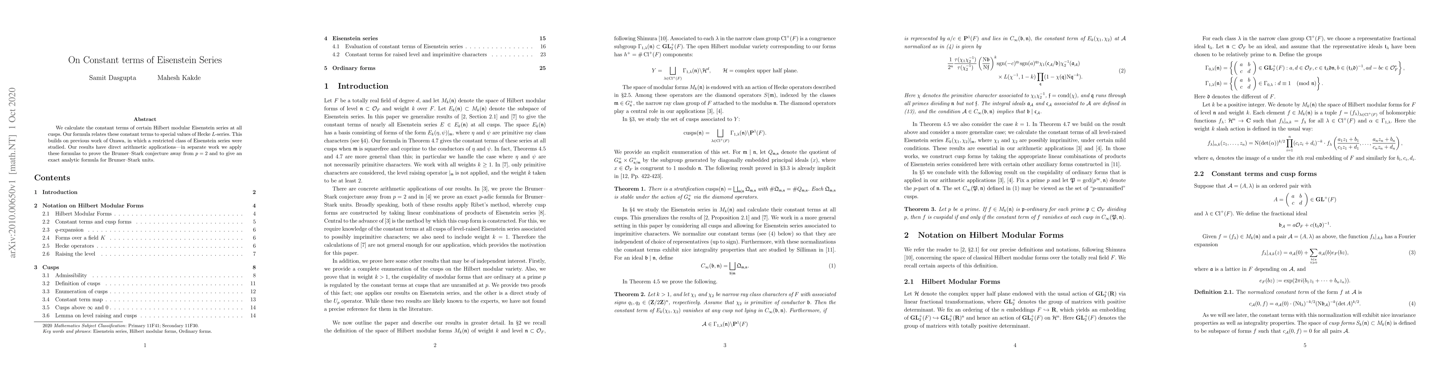 This paper calculates the constant terms of Hilbert modular Eisenstein series at all cusps, relating them to special values of Hecke L-series, building on Ozawa's work, and applies these findings to prove the Brumer-Stark conjecture away from p=2 and provide an exact analytic formula for Brumer-Stark units.