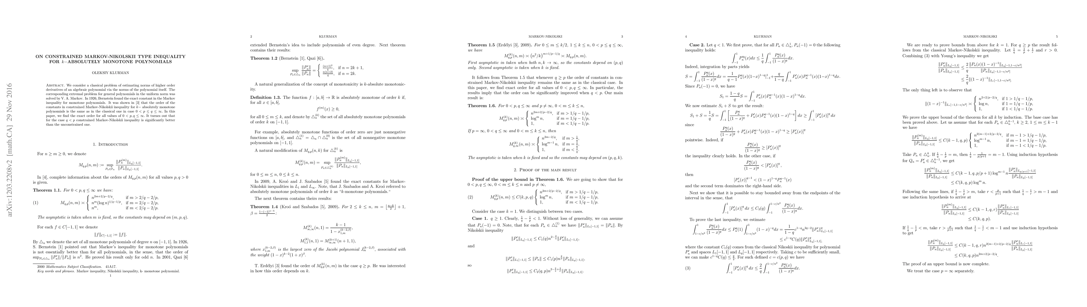 We consider the classical problem of estimating norms of higher order derivatives of algebraic polynomial via the norms of polynomial itself. The corresponding extremal problem for general polynomials in uniform norm was solved by A. A. Markov. In $1926,$ Bernstein found the exact constant in the Markov inequality for monotone polynomials. T. Erdelyi showed that the order of the constants in constrained Markov-Nikolskii inequality for $k-$ absolutely monotone polynomials is the same as in the classical one in case $0