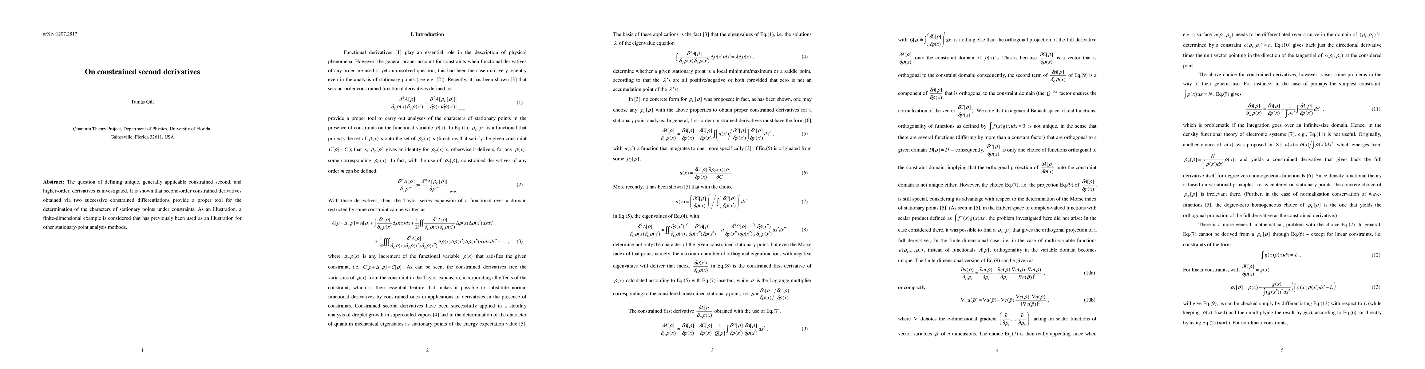 The question of defining unique, generally applicable constrained second, and higher-order, derivatives is investigated. It is shown that second-order constrained derivatives obtained via two successive constrained differentiations provide a proper tool for the determination of the characters of stationary points under constraints. As an illustration, a finite-dimensional example is considered that has previously been used as an illustration for other stationary-point analysis methods.