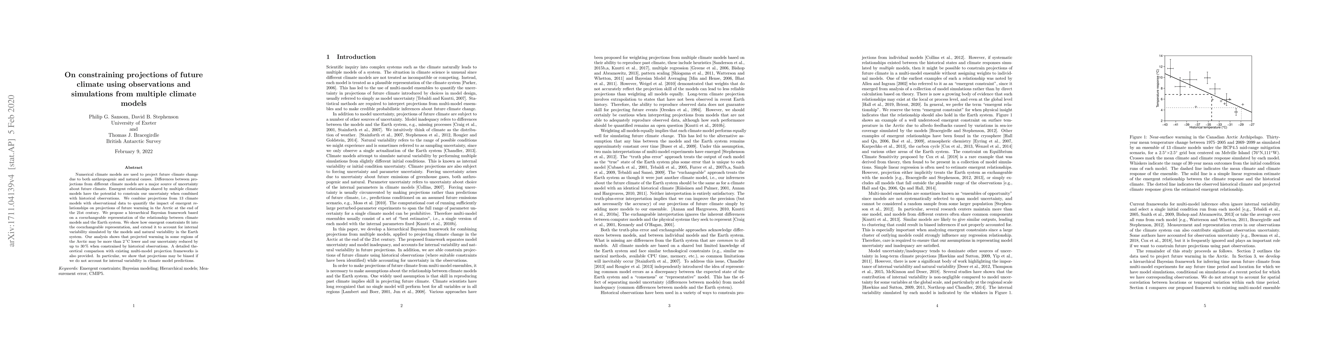 This paper combines projections from 13 climate models and historical observations to constrain future Arctic warming projections using a hierarchical Bayesian framework. The analysis reveals that incorporating emergent relationships can reduce uncertainty and suggest warming may be lower than previously projected.