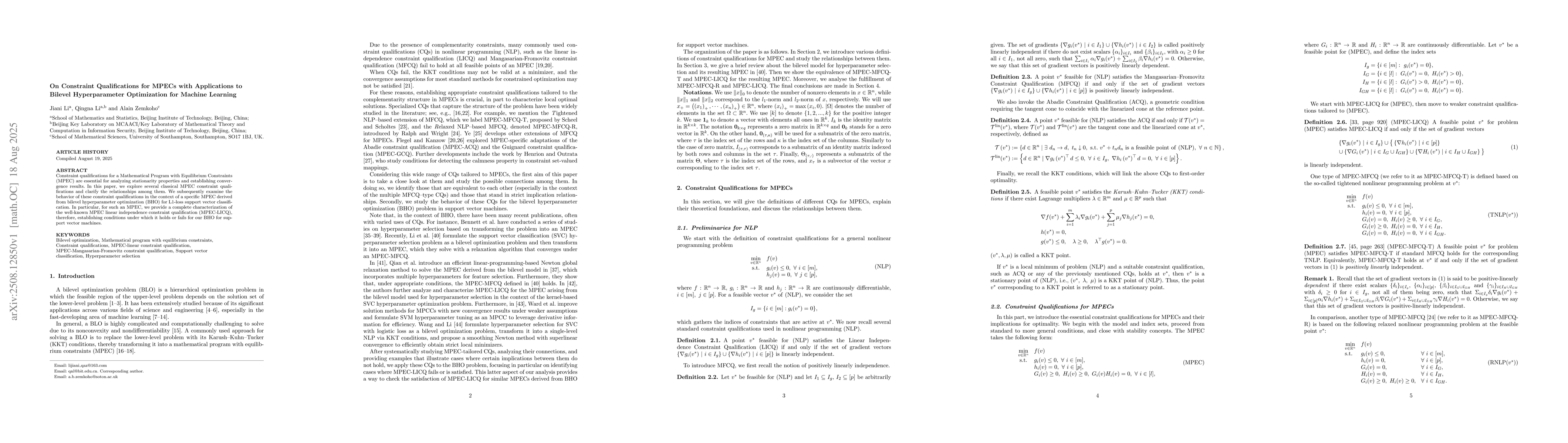 Constraint qualifications for a Mathematical Program with Equilibrium Constraints (MPEC) are essential for analyzing stationarity properties and establishing convergence results. In this paper, we explore several classical MPEC constraint qualifications and clarify the relationships among them. We subsequently examine the behavior of these constraint qualifications in the context of a specific MPEC derived from bilevel hyperparameter optimization (BHO) for L1-loss support vector classification. In particular, for such an MPEC, we provide a complete characterization of the well-known MPEC linear independence constraint qualification (MPEC-LICQ), therefore, establishing conditions under which it holds or fails for our BHO for support vector machines.
