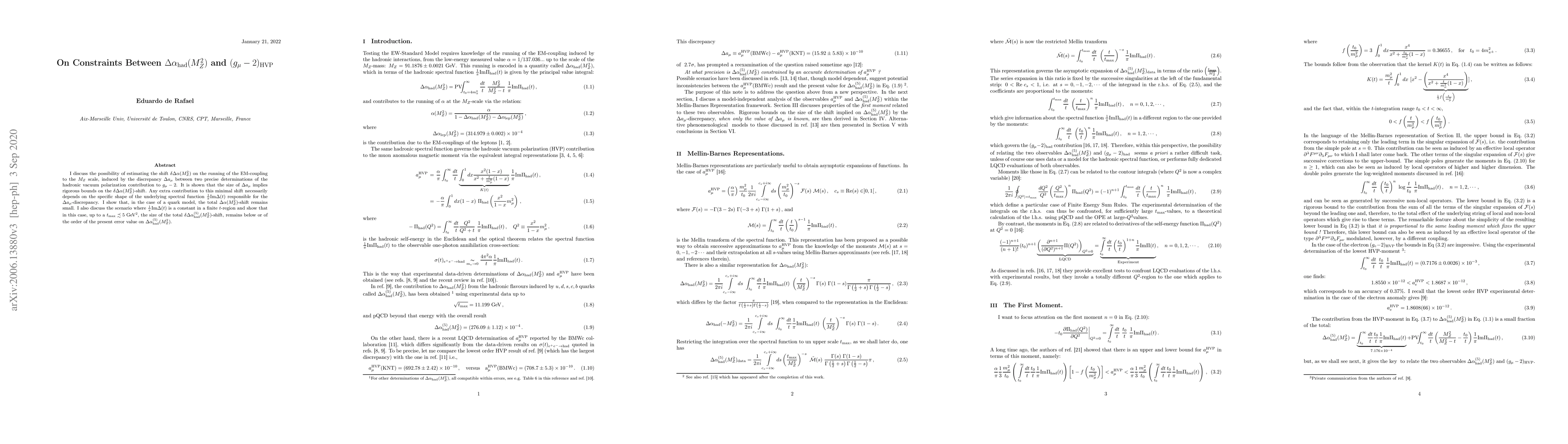 The paper introduces a novel approach to constrain shifts in Δα(5)(M_Z^2) using spectral function moments and Mellin-Barnes representations, independent of specific spectral function shapes.