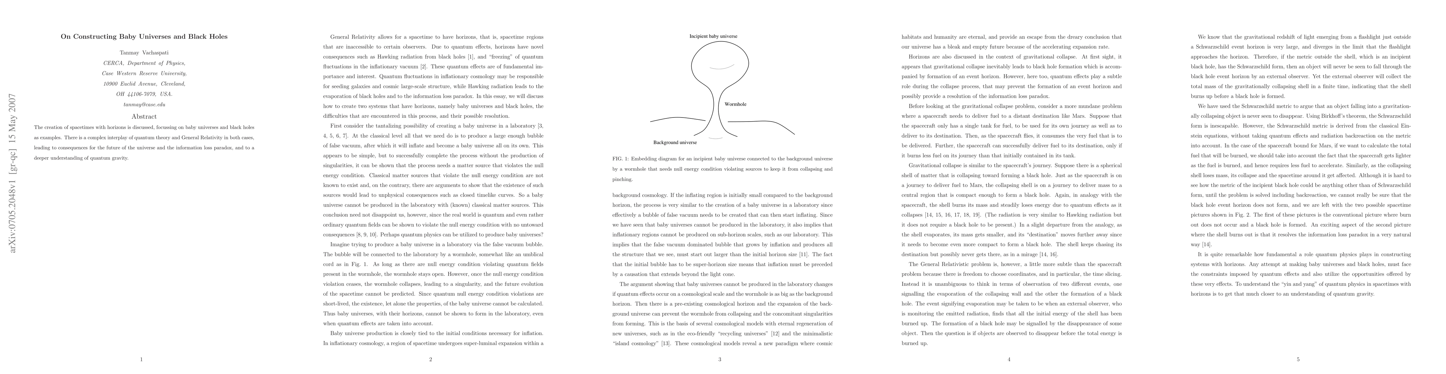 The creation of spacetimes with horizons is discussed, focussing on baby universes and black holes as examples. There is a complex interplay of quantum theory and General Relativity in both cases, leading to consequences for the future of the universe and the information loss paradox, and to a deeper understanding of quantum gravity.