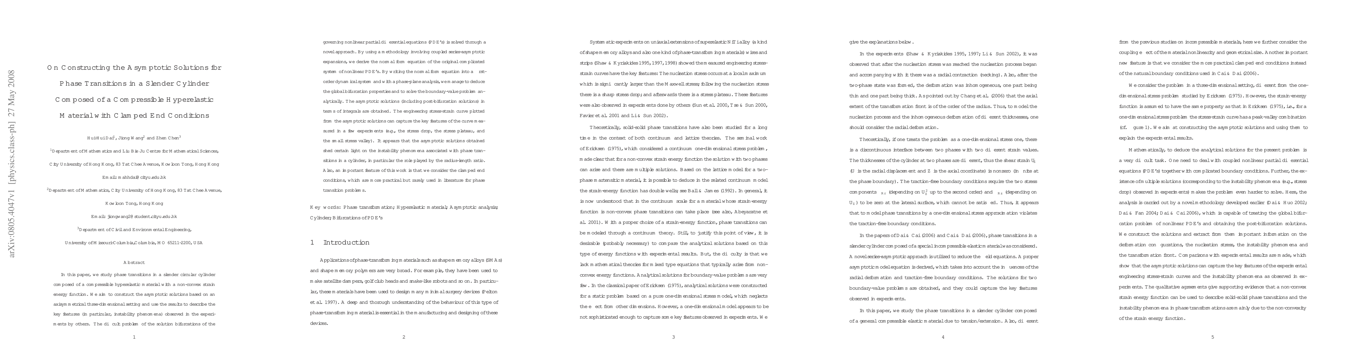 This paper constructs asymptotic solutions for phase transitions in a slender cylindrical compressible hyperelastic material with clamped ends, addressing solution bifurcations via coupled series-asymptotic expansions. The methodology reveals key instability phenomena and provides analytical solutions that match experimental stress-strain curves, highlighting the role of the radius-length ratio.