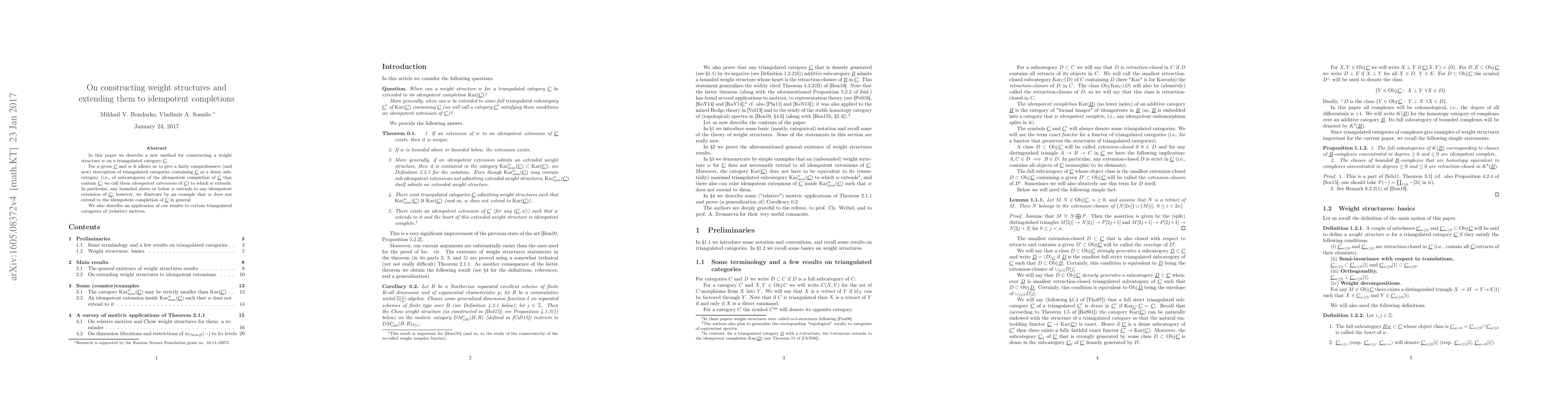 We describe a new method for constructing a weight structure $w$ on a triangulated category $C$. For a given $C$ and $w$ it allow us to give a fairly comprehensive (and new) description of those triangulated categories consisting of retracts of objects of $C$ (i.e., of subcategories of the Karoubi envelope of $C$ that contain $C$; we call them idempotent extensions of $C$) such that $w$ extends to them. In particular, any bounded above or below $w$ extends to any idempotent extension of $C$. We also discuss the applications of our results to certain triangulated categories of ("relative") motives.
