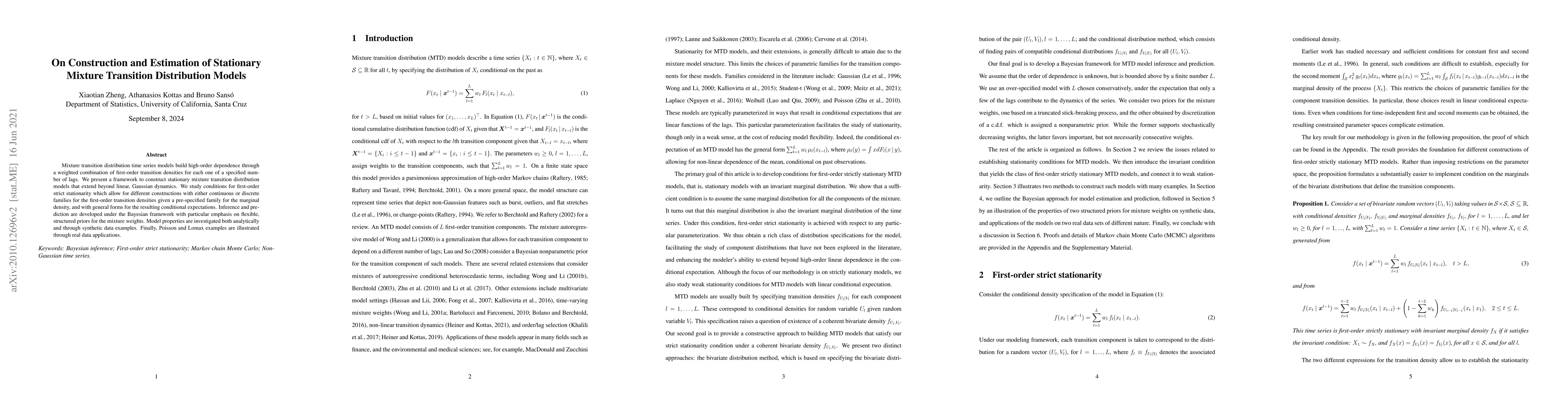 Mixture transition distribution time series models build high-order dependence through a weighted combination of first-order transition densities for each one of a specified number of lags. We present a framework to construct stationary transition mixture distribution models that extend beyond linear, Gaussian dynamics. We study conditions for first-order strict stationarity which allow for different constructions with either continuous or discrete families for the first-order transition densities given a pre-specified family for the marginal density, and with general forms for the resulting conditional expectations. Inference and prediction are developed under the Bayesian framework with particular emphasis on flexible, structured priors for the mixture weights. Model properties are investigated both analytically and through synthetic data examples. Finally, Poisson and Lomax examples are illustrated through real data applications.