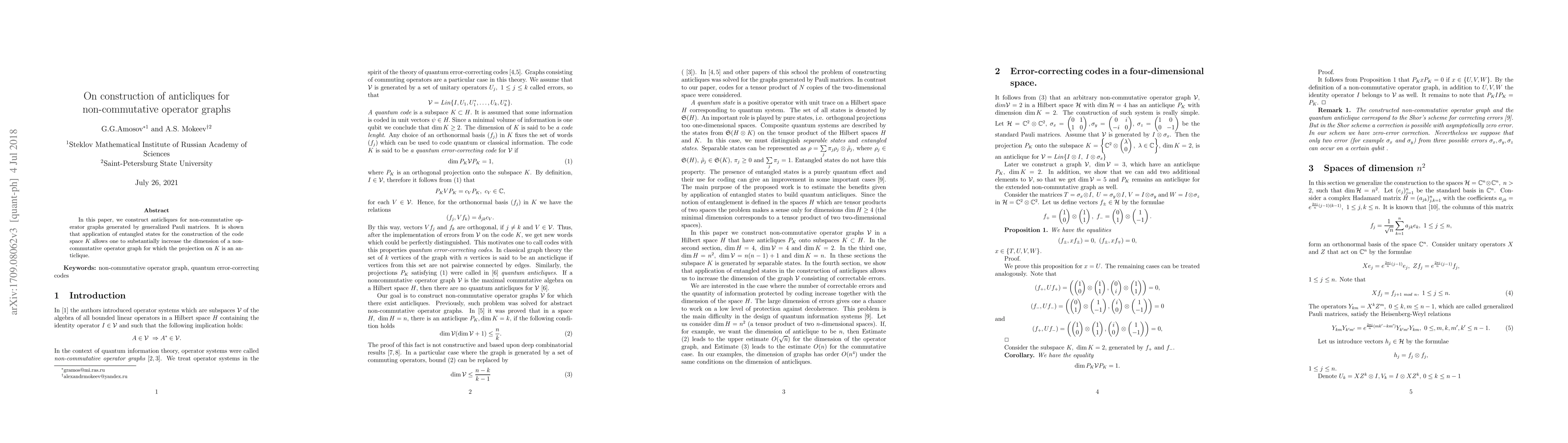 In this paper anticliques for non-commutative operator graphs generated by the generalized Pauli matrices are constructed. It is shown that application of entangled states for the construction of code space K allows one to substantially increase the dimension of a non-commutative operator graph for which the projection on K is an anticlique.
