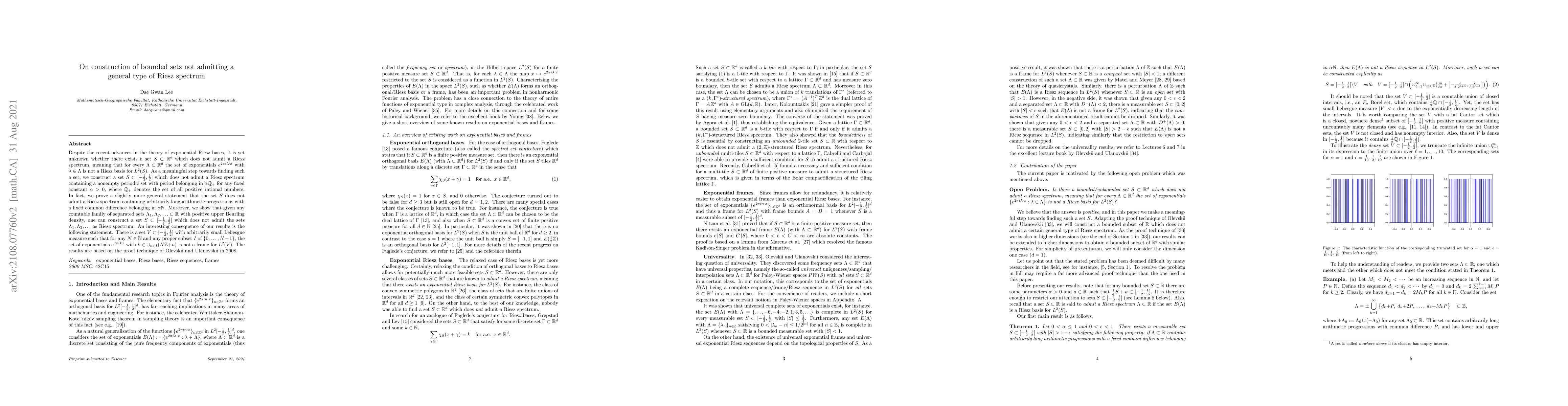 Despite the recent advances in the theory of exponential Riesz bases, it is yet unknown whether there exists a set $S \subset \mathbb{R}^d$ which does not admit a Riesz spectrum, meaning that for every $\Lambda \subset \mathbb{R}^d$ the set of exponentials $e^{2\pi i \lambda \cdot x}$ with $\lambda\in\Lambda$ is not a Riesz basis for $L^2(S)$. As a meaningful step towards finding such a set, we construct a set $S \subset [-\frac{1}{2}, \frac{1}{2}]$ which does not admit a Riesz spectrum containing a nonempty periodic set with period belonging in $\alpha \mathbb{Q}_+$ for any fixed constant $\alpha > 0$, where $\mathbb{Q}_+$ denotes the set of all positive rational numbers. In fact, we prove a slightly more general statement that the set $S$ does not admit a Riesz spectrum containing arbitrarily long arithmetic progressions with a fixed common difference belonging in $\alpha \mathbb{N}$. Moreover, we show that given any countable family of separated sets $\Lambda_1, \Lambda_2, \ldots \subset \mathbb{R}$ with positive upper Beurling density, one can construct a set $S \subset [-\frac{1}{2}, \frac{1}{2}]$ which does not admit the sets $\Lambda_1, \Lambda_2, \ldots$ as Riesz spectrum. An interesting consequence of our results is the following statement. There is a set $V \subset [-\frac{1}{2}, \frac{1}{2}]$ with arbitrarily small Lebesgue measure such that for any $N \in \mathbb{N}$ and any proper subset $I$ of $\{ 0, \ldots, N-1 \}$, the set of exponentials $e^{2\pi i k x}$ with $k \in \cup_{n \in I} (N\mathbb{Z} {+} n)$ is not a frame for $L^2(V)$. The results are based on the proof technique of Olevskii and Ulanovskii in 2008.