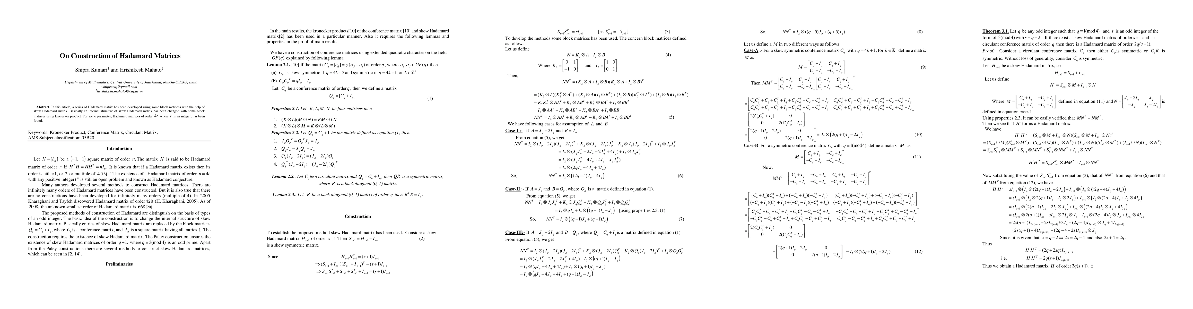 This paper develops a series of Hadamard matrices using block matrices and the skew Hadamard matrix, employing the Kronecker product to modify the internal structure. It finds Hadamard matrices of order 4t for integer values of t.