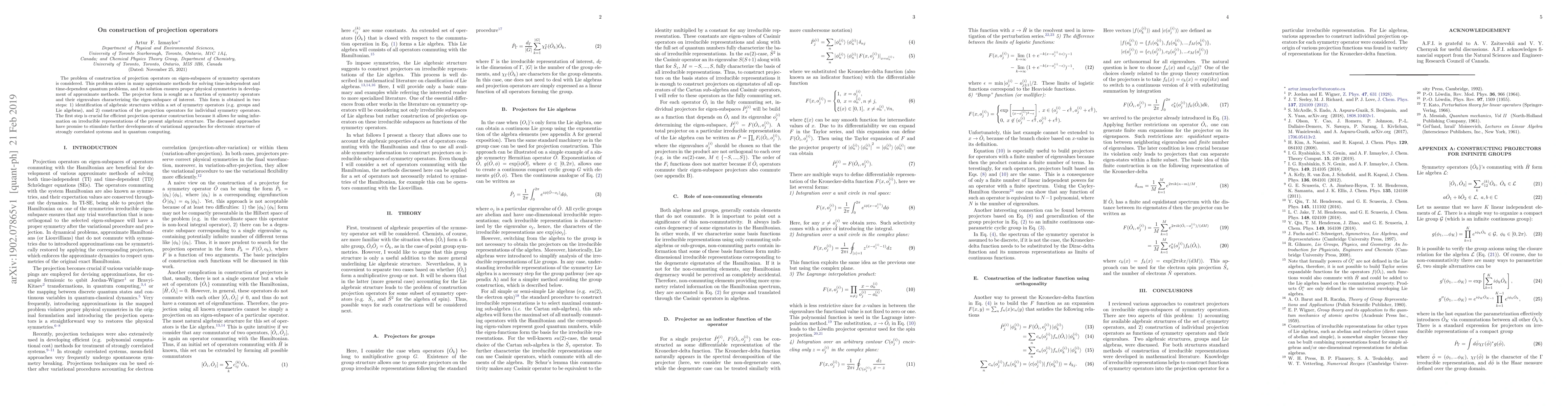 The problem of construction of projection operators on eigen-subspaces of symmetry operators is considered. This problem arises in many approximate methods for solving time-independent and time-dependent quantum problems, and its solution ensures proper physical symmetries in development of approximate methods. The projector form is sought as a function of symmetry operators and their eigenvalues characterizing the eigen-subspace of interest. This form is obtained in two steps: 1) identification of algebraic structures within a set of symmetry operators (e.g. groups and Lie algebras), and 2) construction of the projection operators for individual symmetry operators. The first step is crucial for efficient projection operator construction because it allows for using information on irreducible representations of the present algebraic structure. The discussed approaches have promise to stimulate further developments of variational approaches for electronic structure of strongly correlated systems and in quantum computing.