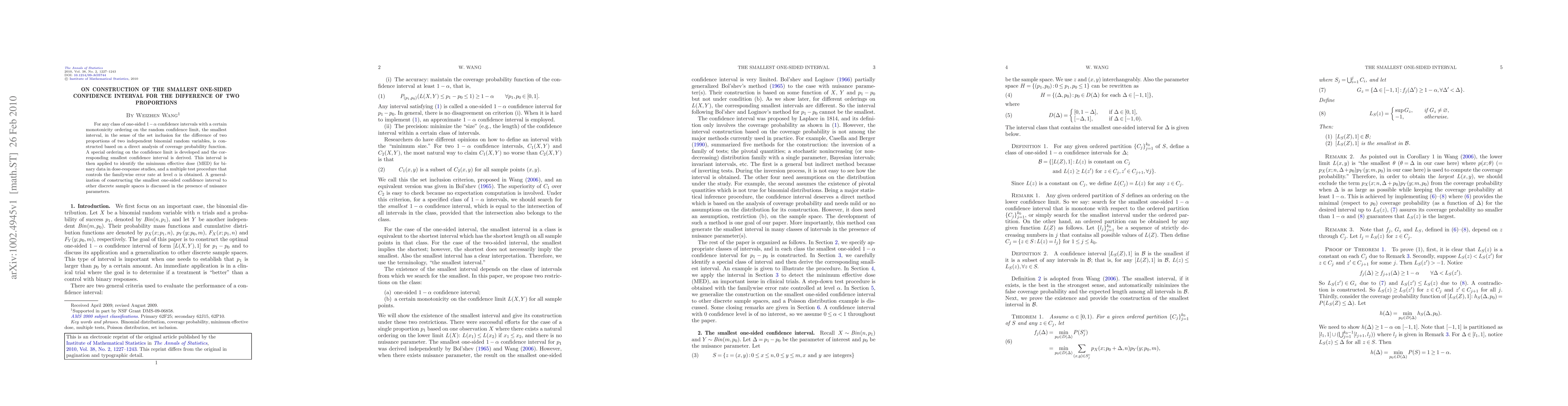 Summary: The paper constructs the smallest one-sided confidence interval for the difference of two proportions using a direct coverage probability analysis and a special ordering. It applies this interval to determine the minimum effective dose in dose-response studies and discusses its extension to other discrete sample spaces with nuisance parameters.
