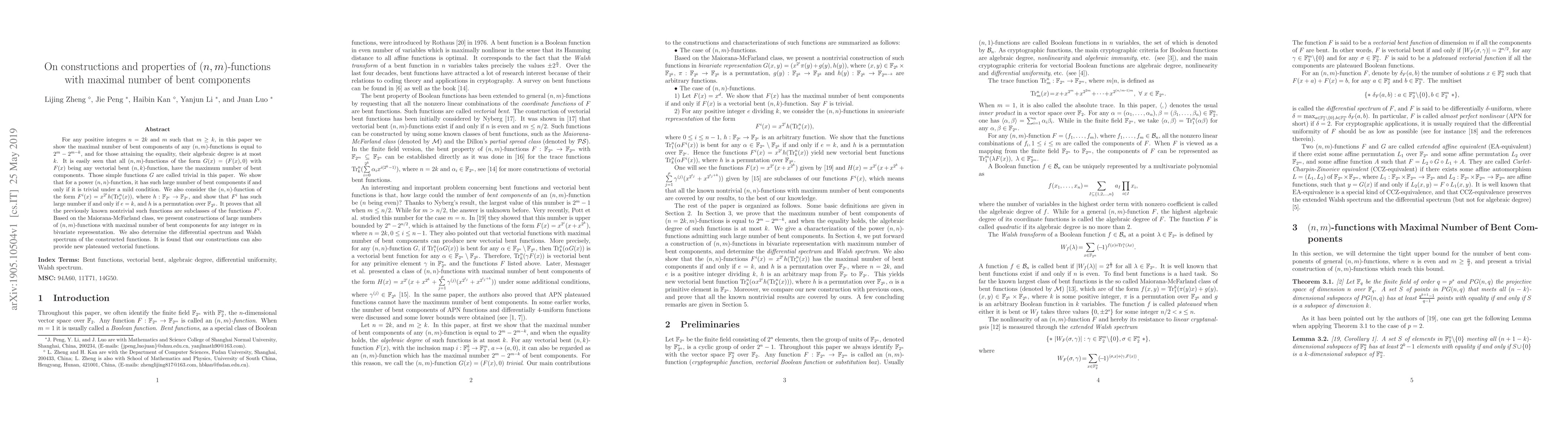 This paper investigates the maximal number of bent components in $(n,m)$-functions, proving that it equals $2^{m}-2^{m-k}$ for $n=2k$ and $m\geq k$. It shows that trivial functions of the form $G(x)=(F(x),0)$ with $F(x)$ being any vectorial bent $(n,k)$-function achieve this maximum, while nontrivial functions fall under specific forms.