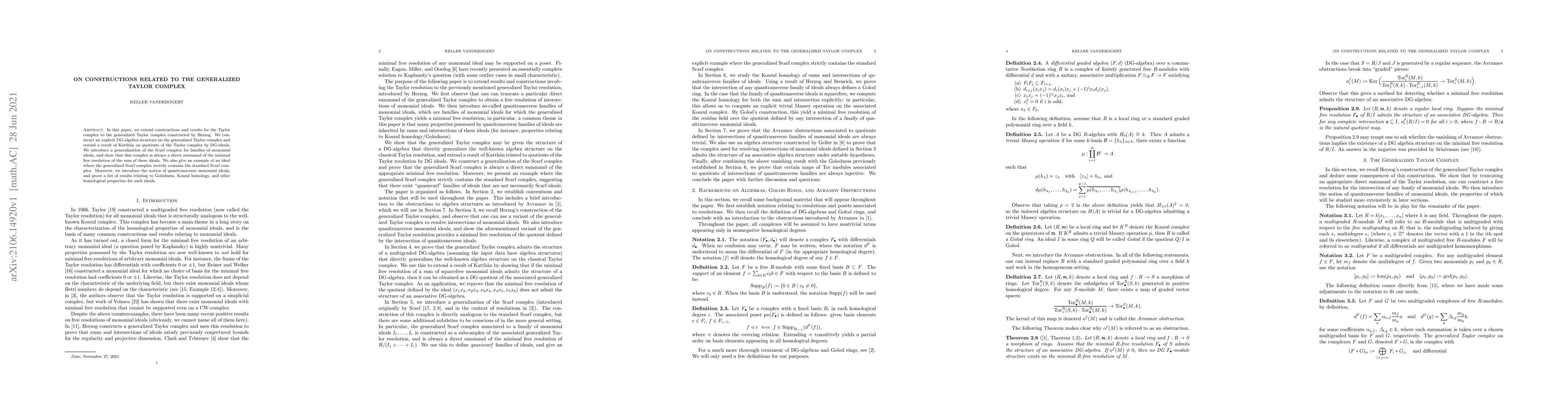 In this paper, we extend constructions and results for the Taylor complex to the generalized Taylor complex constructed by Herzog. We construct an explicit DG-algebra structure on the generalized Taylor complex and extend a result of Katth\"an on quotients of the Taylor complex by DG-ideals. We introduce a generalization of the Scarf complex for families of monomial ideals, and show that this complex is always a direct summand of the minimal free resolution of the sum of these ideals. We also give an example of an ideal where the generalized Scarf complex strictly contains the standard Scarf complex. Moreover, we introduce the notion of quasitransverse monomial ideals, and prove a list of results relating to Golodness, Koszul homology, and other homological properties for such ideals.