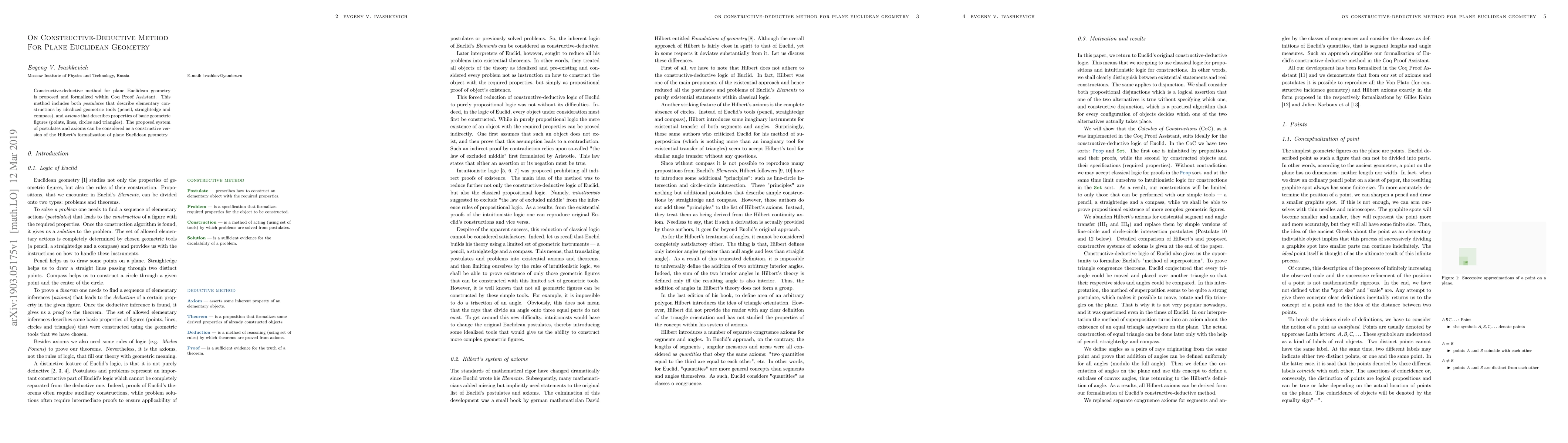 Constructive-deductive method for plane Euclidean geometry is proposed and formalized within Coq Proof Assistant. This method includes both postulates that describe elementary constructions by idealized geometric tools (pencil, straightedge and compass), and axioms that describes properties of basic geometric figures (points, lines, circles and triangles). The proposed system of postulates and axioms can be considered as a constructive version of the Hilbert's formalization of plane Euclidean geometry.