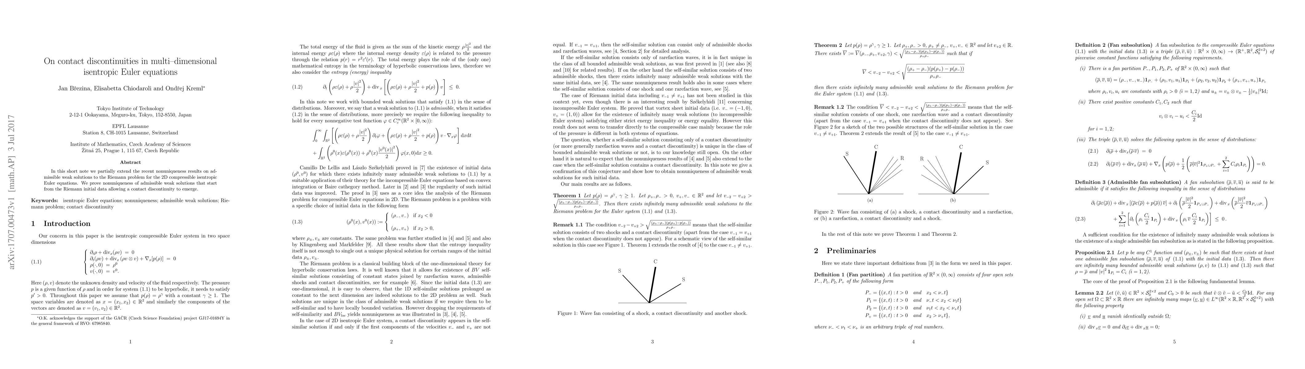 Summary: This paper extends recent findings on nonuniqueness of admissible weak solutions for the 2D compressible isentropic Euler equations, demonstrating that solutions can diverge when starting from initial data that permits the emergence of contact discontinuities.
