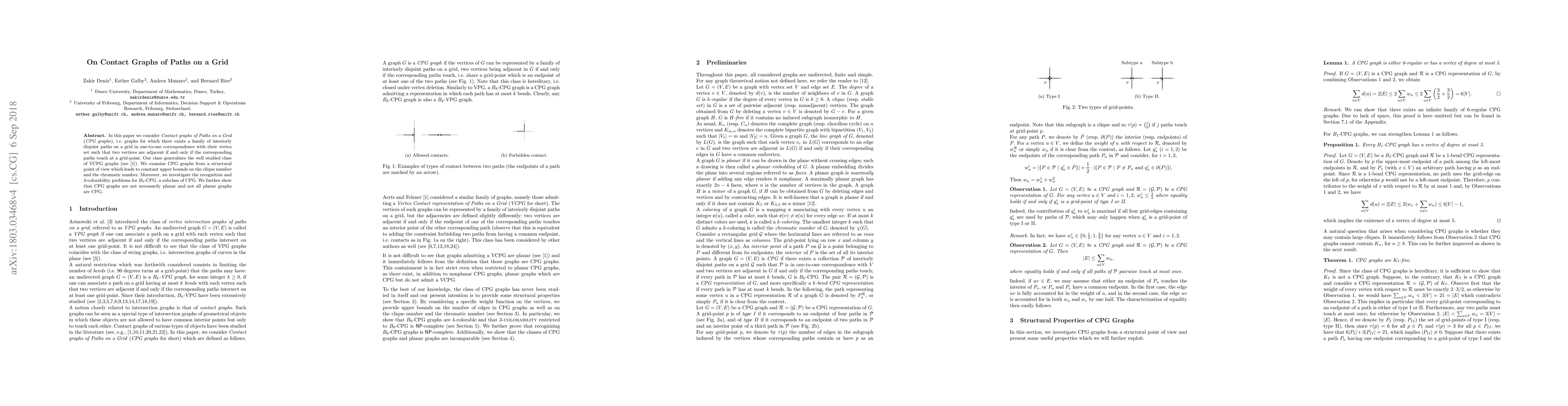 In this paper we consider Contact graphs of Paths on a Grid (CPG graphs), i.e. graphs for which there exists a family of interiorly disjoint paths on a grid in one-to-one correspondence with their vertex set such that two vertices are adjacent if and only if the corresponding paths touch at a grid-point. Our class generalizes the well studied class of VCPG graphs (see [1]). We examine CPG graphs from a structural point of view which leads to constant upper bounds on the clique number and the chromatic number. Moreover, we investigate the recognition and 3-colorability problems for $B_0$-CPG, a subclass of CPG. We further show that CPG graphs are not necessarily planar and not all planar graphs are CPG.