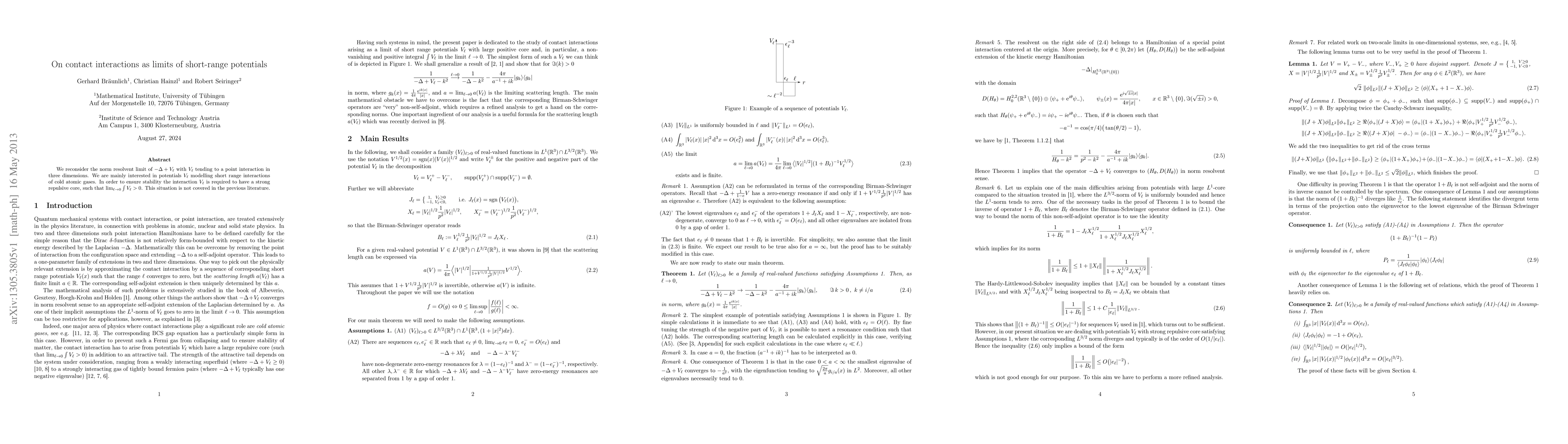 This research contributes to the understanding of contact interactions as limits of short-range potentials, particularly relevant for cold atomic gases, and provides new insights into the behavior of these systems under specific stability conditions.