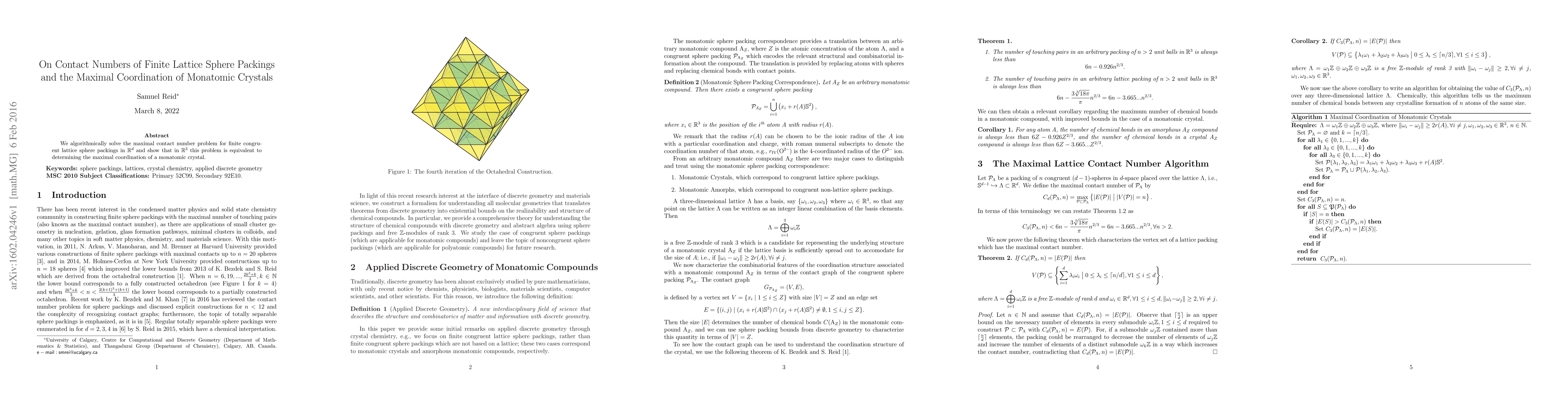 Summary: This paper presents an algorithmic approach to determine the maximal contact number in finite lattice sphere packings in $\mathbb{R}^d$, and establishes the equivalence between this problem in $\mathbb{R}^3$ and finding the maximal coordination of monatomic crystals.