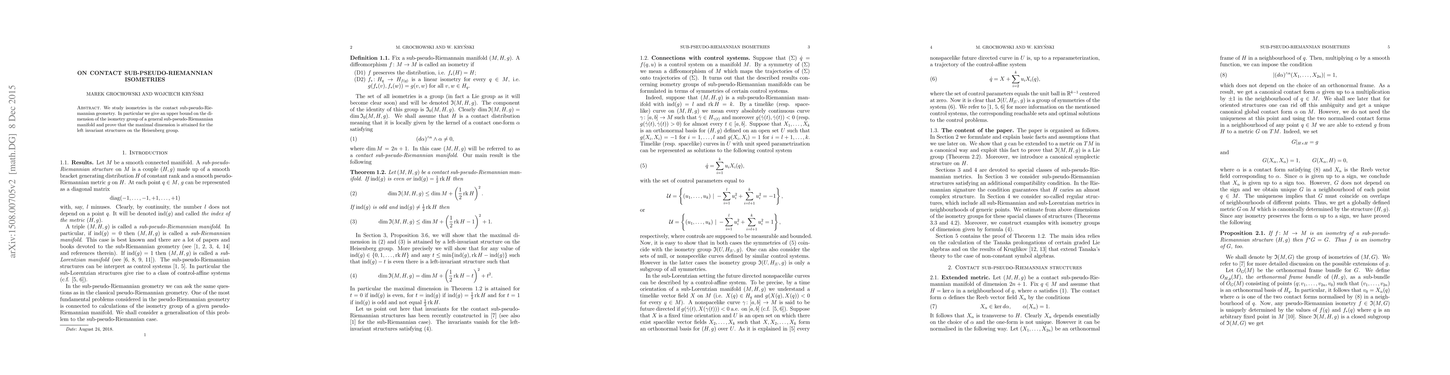 This paper investigates isometries within the context of contact sub-pseudo-Riemannian geometry, establishing an upper bound on the dimension of the isometry group for general sub-pseudo-Riemannian manifolds and demonstrating that the maximal dimension is achieved for left invariant structures on the Heisenberg group.