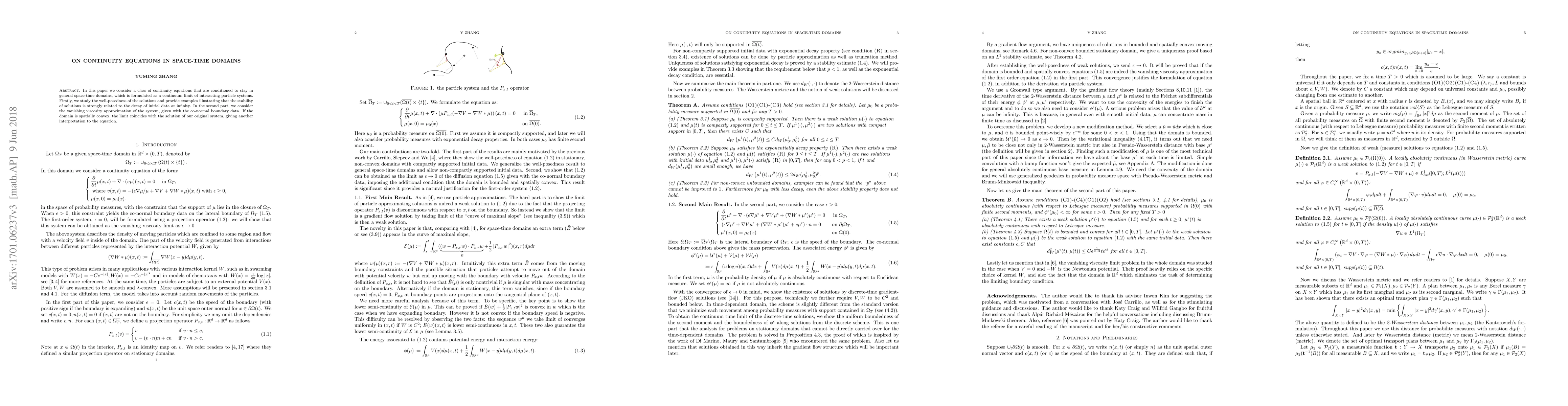 This paper explores continuity equations constrained within space-time domains, derived from interacting particle systems. It examines solution stability linked to initial data decay and investigates the vanishing viscosity approximation, showing that for spatially convex domains, the limit matches the original system's solution.