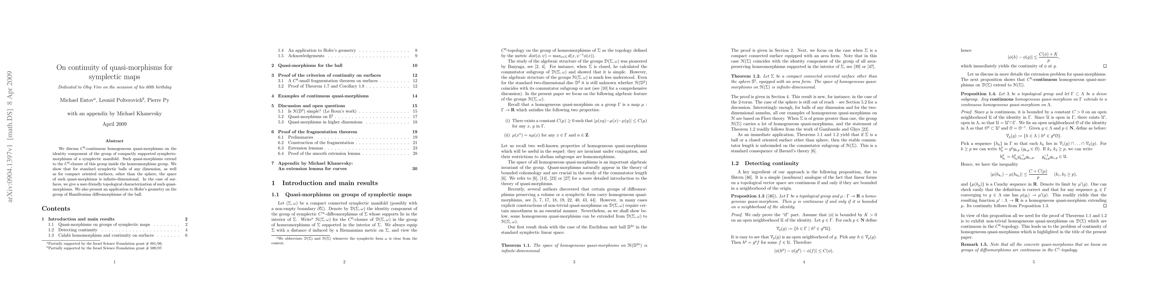 This paper investigates the continuity and extension of quasi-morphisms within the group of compactly supported symplectomorphisms, demonstrating that their space is infinite-dimensional for standard symplectic balls and non-spherical surfaces. It also provides a topological characterization for surface quasi-morphisms and applies the findings to Hofer's geometry on Hamiltonian diffeomorphisms.