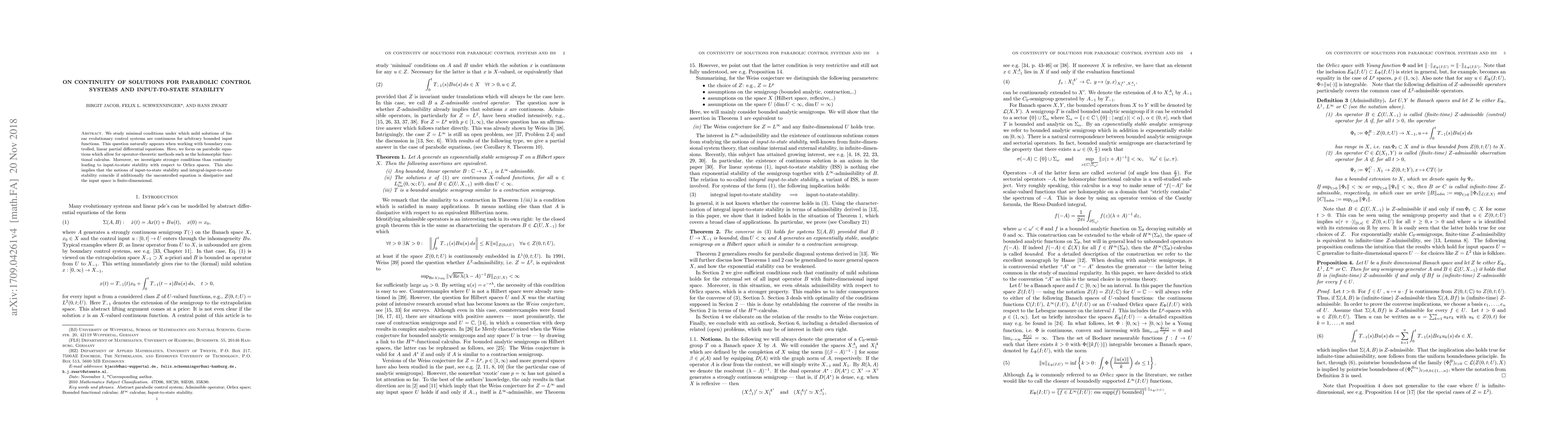 This paper explores minimal conditions for the continuity of mild solutions in linear evolutionary control systems, particularly parabolic equations, and investigates conditions leading to input-to-state stability within Orlicz spaces, showing that input-to-state stability and integral-input-to-state stability coincide under certain dissipative conditions.