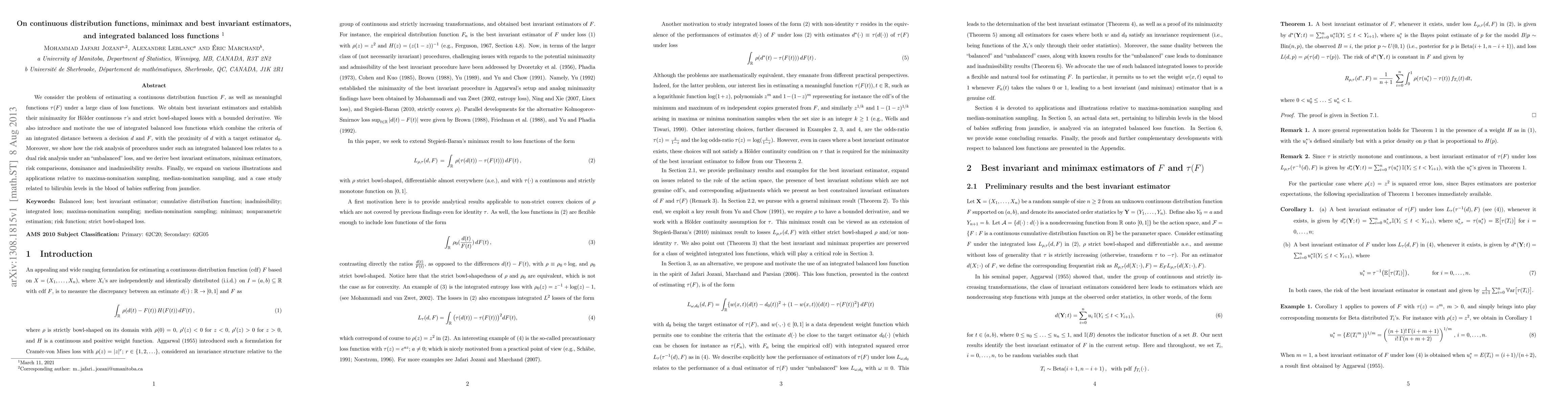 This paper develops best invariant estimators for continuous distribution functions, establishing their minimaxity under certain conditions. It also introduces integrated balanced loss functions to compare risks and provides applications in various real-world scenarios.