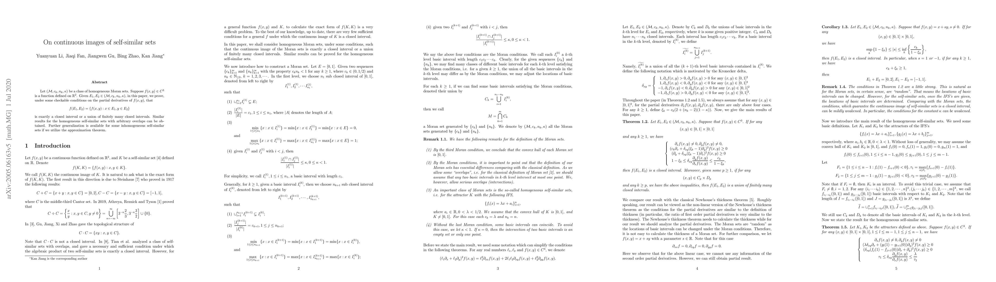 Let $(\mathcal{M}, c_k, n_k,\kappa)$ be a class of homogeneous Moran sets. Suppose $f(x,y)\in C^3$ is a function defined on $\mathbb{R}^2$. Given $E_1, E_2\in(\mathcal{M}, c_k, n_k,\kappa) $, in this paper, we prove, under some checkable conditions on the partial derivatives of $f(x,y)$, that $$f(E_1,E_2)=\{f(x,y):x\in E_1,y\in E_2\}$$ is exactly a closed interval or a union of finitely many closed intervals. Similar results for the homogeneous self-similar sets with arbitrary overlaps can be obtained. Further generalization is available for some inhomogeneous self-similar sets if we utilize the approximation theorem.