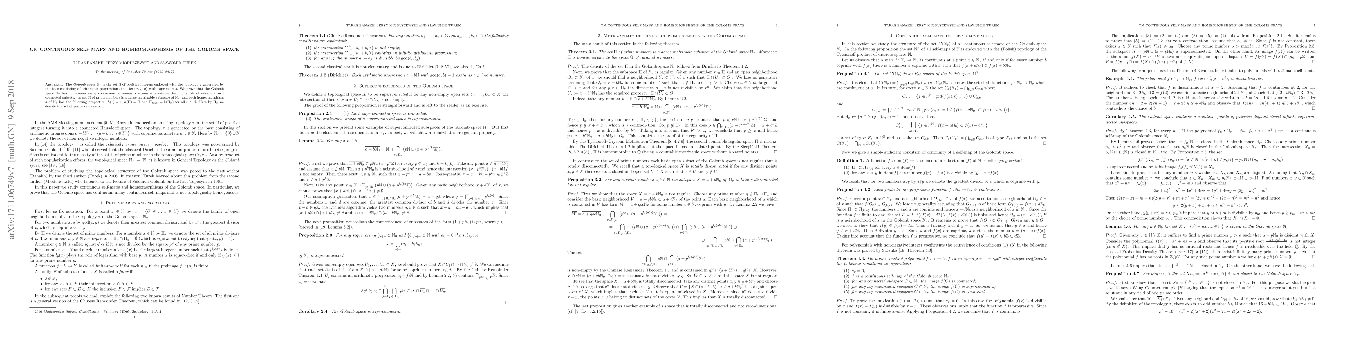 The Golomb space has continuum many continuous self-maps, a countable family of infinite connected subsets, and specific properties for homeomorphisms that preserve prime numbers.