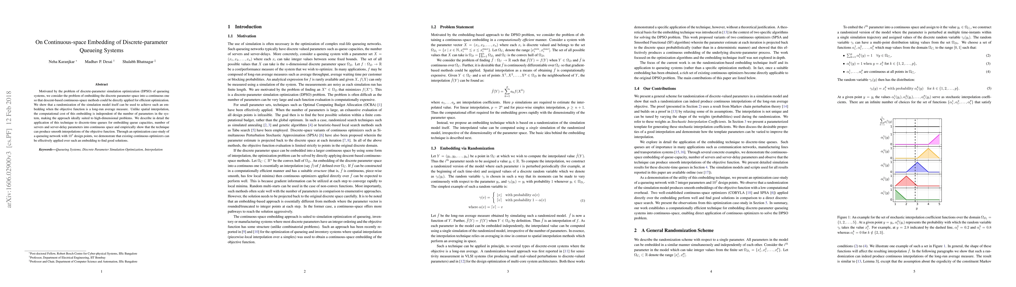 This paper proposes a method for embedding discrete-parameter queueing systems into continuous space to enable efficient optimization using continuous-space techniques. The approach randomizes the simulation model, allowing for smooth interpolations and optimization without scaling computational costs with the number of parameters.